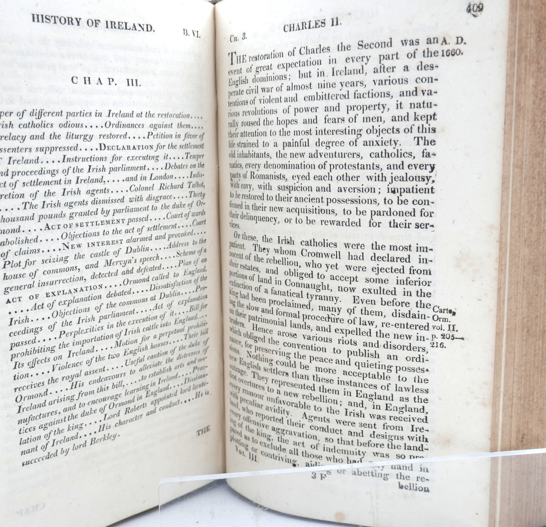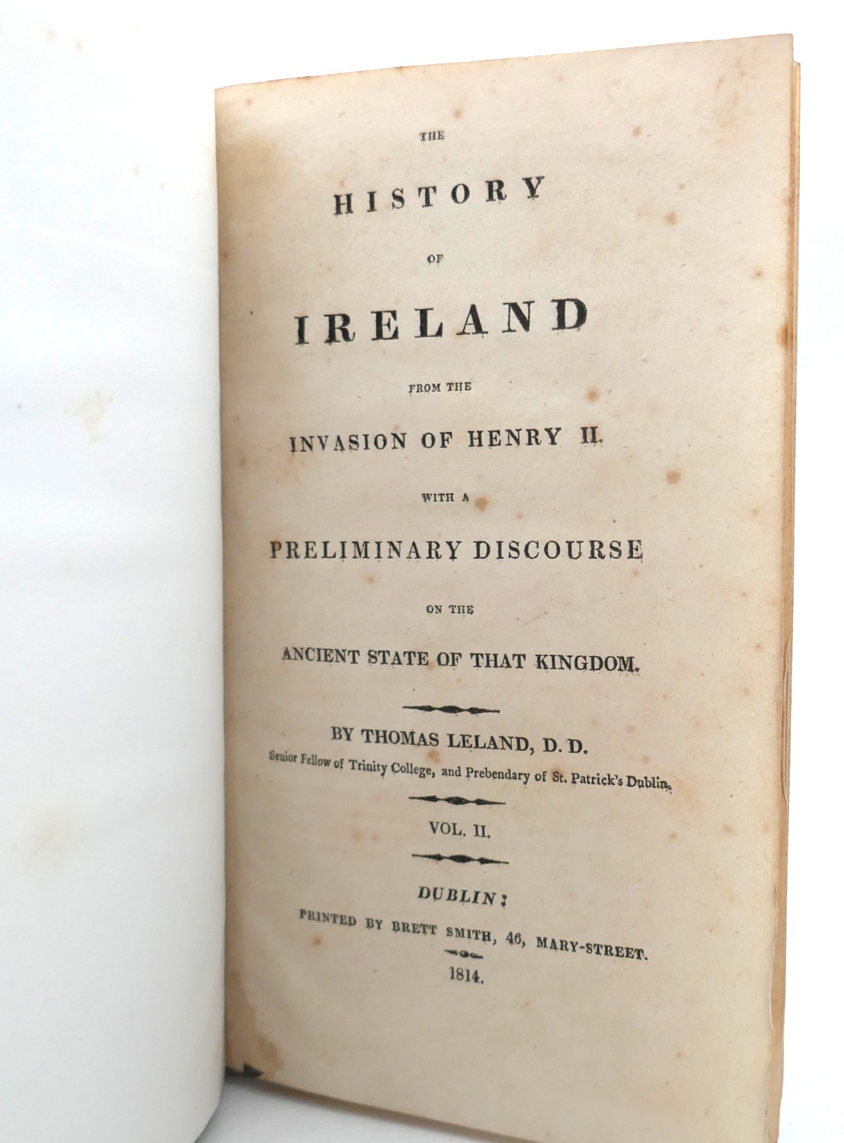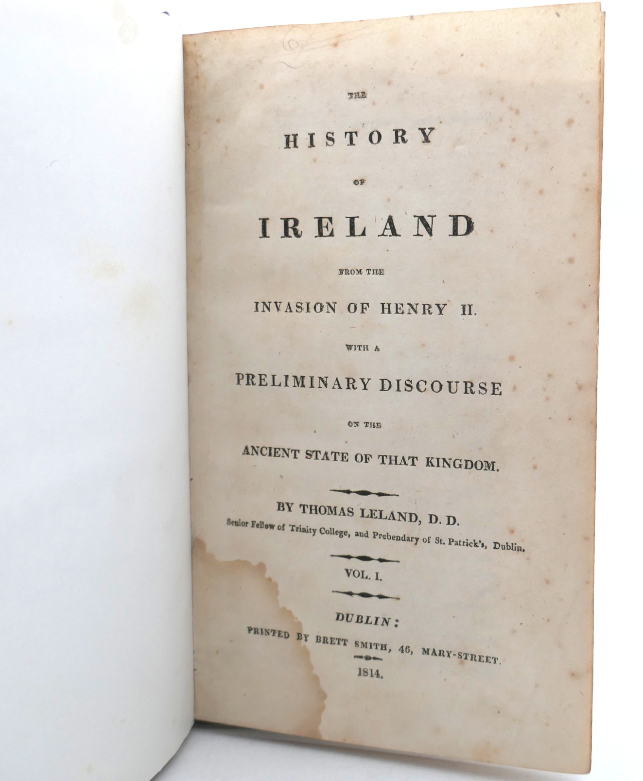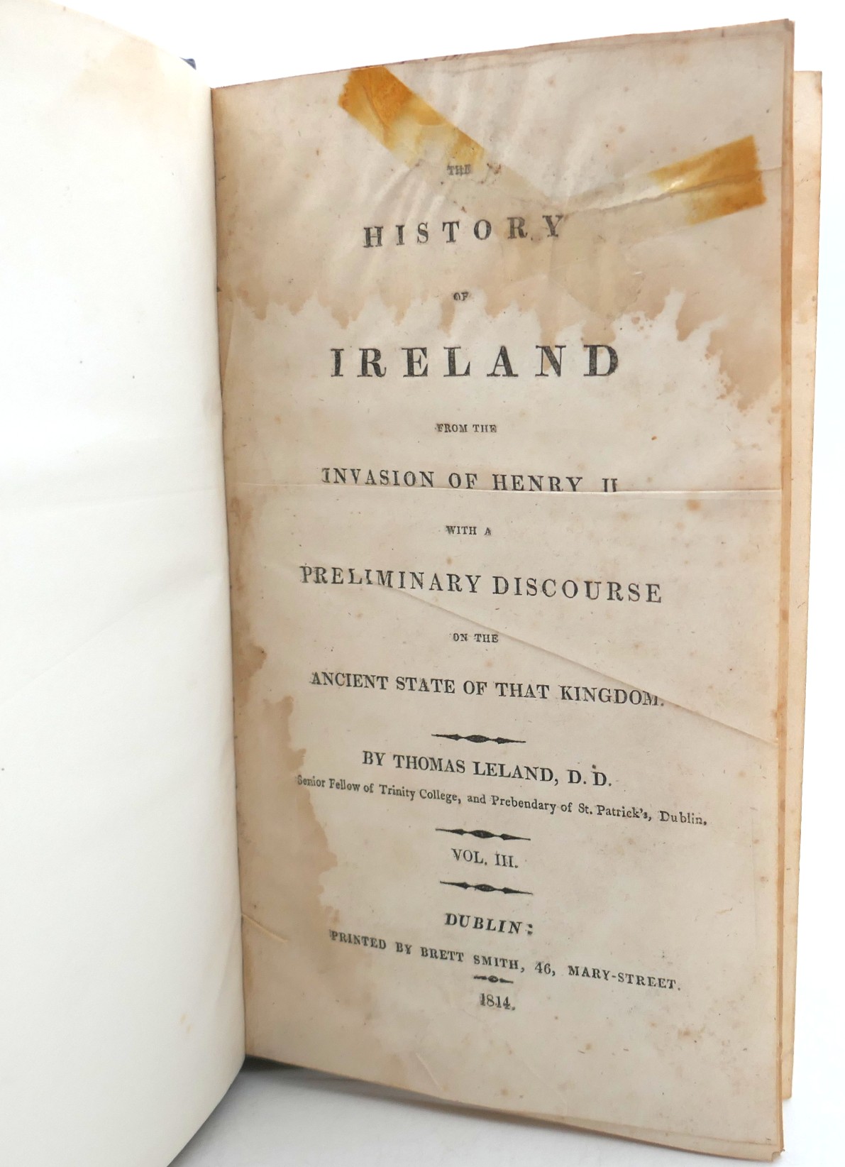 The History of Ireland from the Invasion of Henry II. With a Preliminary Discourse on the Ancient State of that Kingdom. Three volumes. Dublin: Brett Smith, 1814. Pp, (1) lii, 379; (2),509; (3),630, [30] Index. Rebound in blue buckram boards, titles in gilt to spines. Water stain to lower inner corners of title page to xiii; title page of vol 3, with tape repairs; otherwise contents page in very good condition.