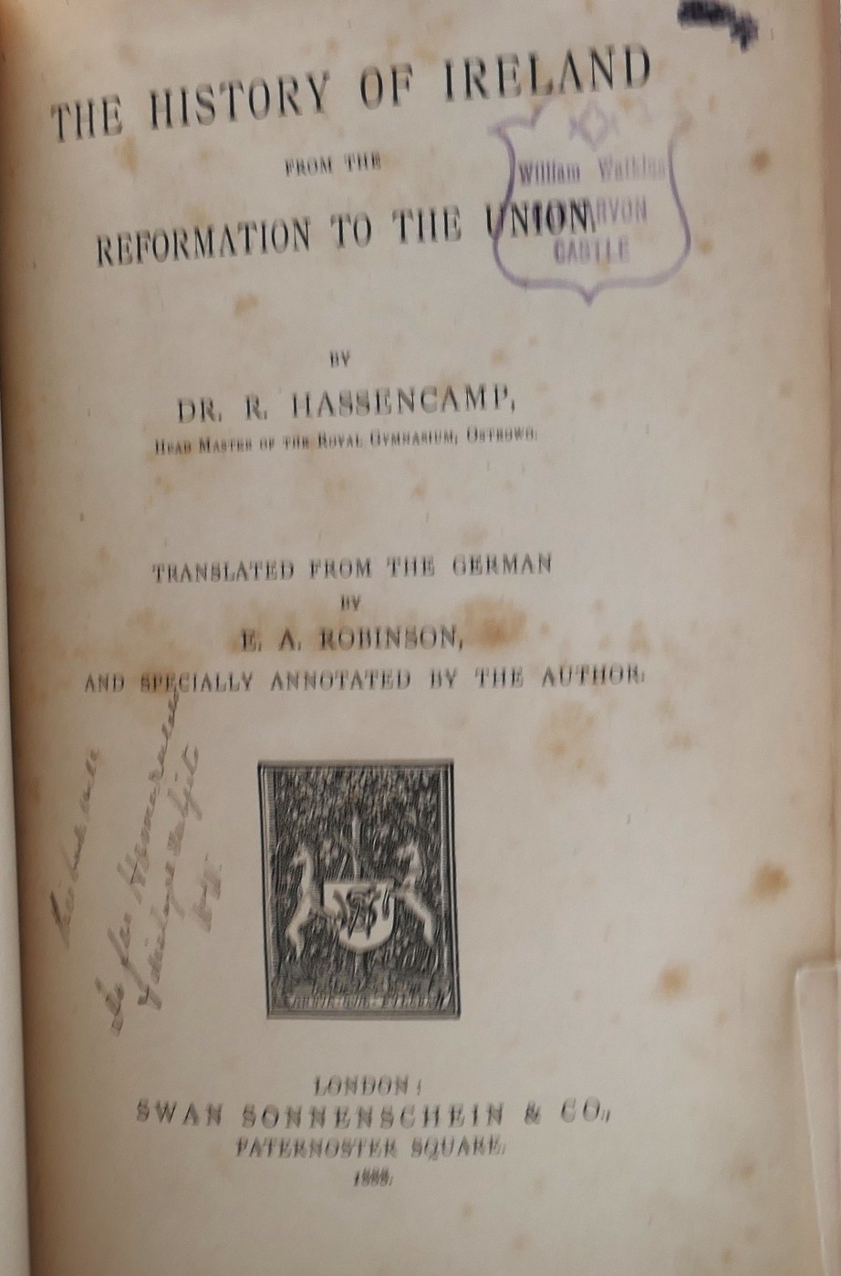 The History of Ireland from the Reformation to the Union. Translated from the German by E.A. Robinson, and Specially Annotated by the Author. London: Sonnenschein & Co., 1888. First Edition Thus. Pp xii, 348. Maroon cloth boards. Neat ink stamp to title page, otherwise a ver good copy.