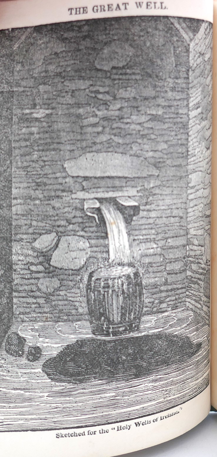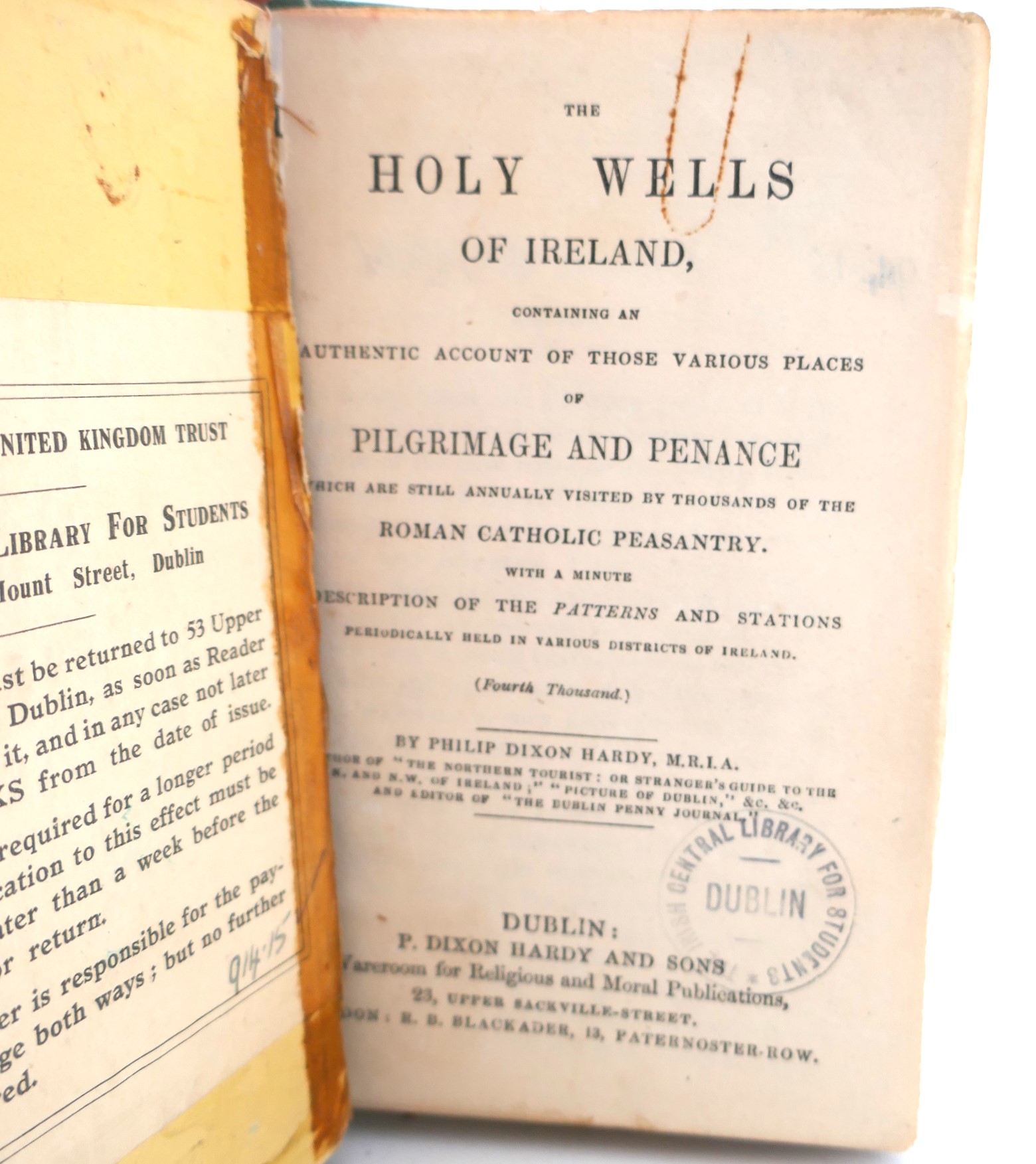 The Holy Wells of Ireland Containing an Authentic Account of Those Various Places of Pilgrimage and Penance Which Are Still Annually Visited by Roman Catholic Peasantry. With a Minute Description of the Patterns and Stations Periodically held in Various Districts of Ireland. Dublin : Hardy, & Walker, [1840]. Fourth Thousand. Small 12mo. Pp viii, 120. Ex library copy, with ink stamps & with occasional label residue to endpapers. Rebound in green cloth boards, title in gilt to spine. Original cloth covers bound-in. A good copy.
