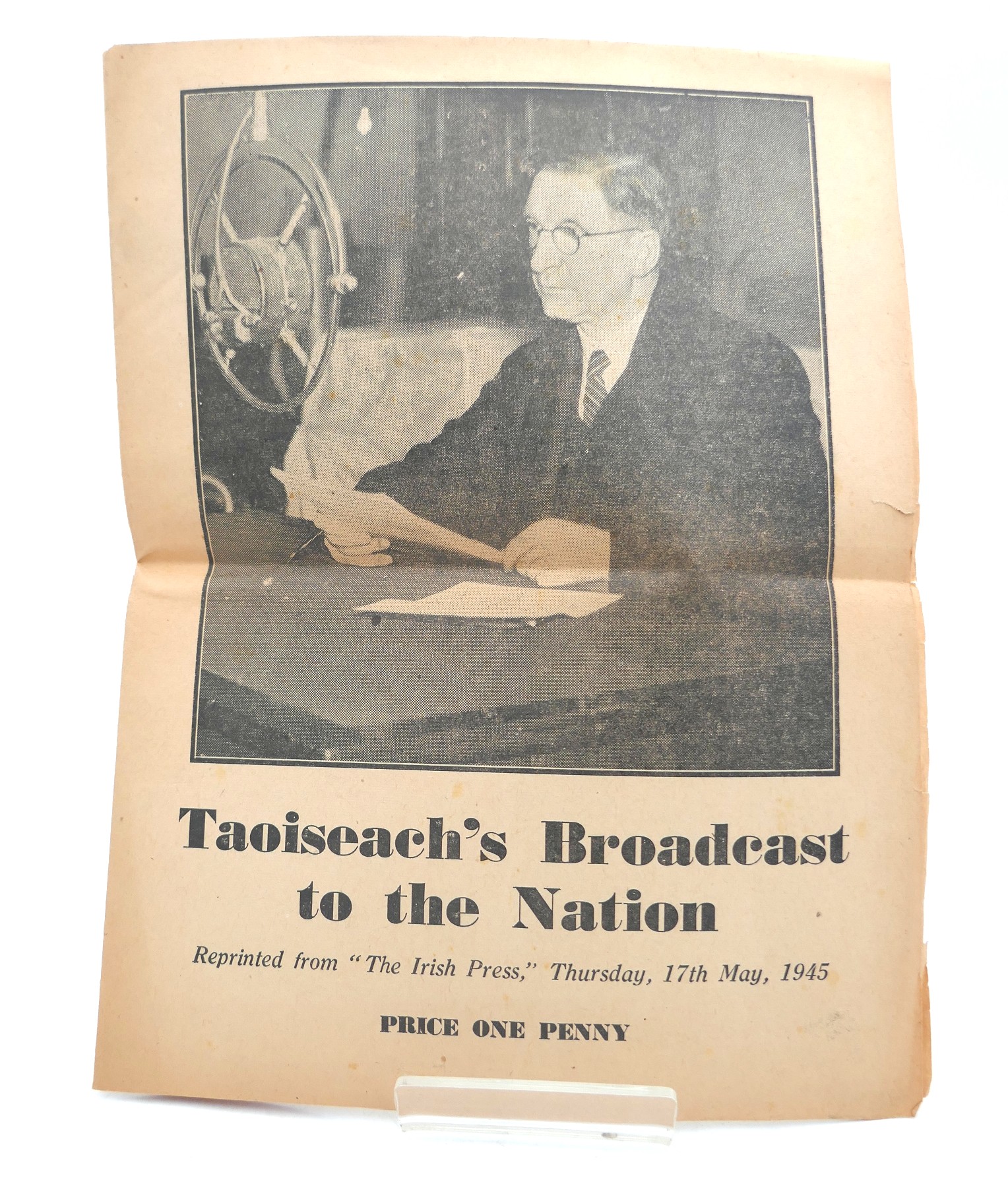 Inserted is a copy of: ‘Taoiseach’s Broadcast to the Nation’ Reprinted The Irish Press News paper on the 17th May 1945. (8 pages, folded. Photograph of De Valera to front cover. Fragile).