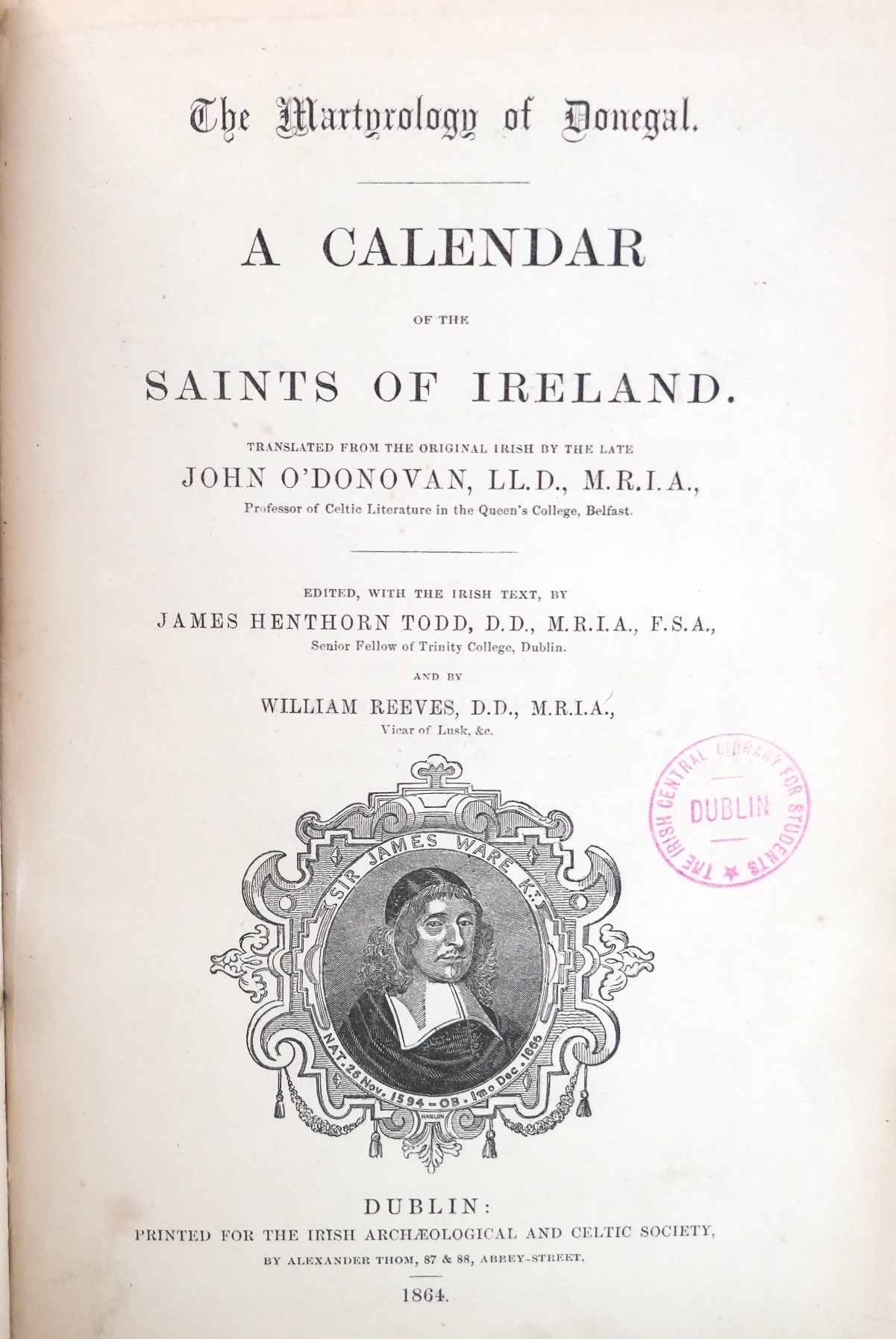 The Martyrology of Donegal. A Calendar of the Saints of Ireland. Translated from the Original Irish by the Late John O’Donovan. Edited, with the Irish Text by James Henthorn Todd and by William Reeves. Dublin: Irish Archaeological & Celtic Society, 1864. Pp, [lv], 566, [vii], 12. Large 8vo. Ex library copy, with ink stamps & with occasional label residue to endpapers. Rebound in half maroon calf & cloth boards, title in gilt to spine. A very good copy.