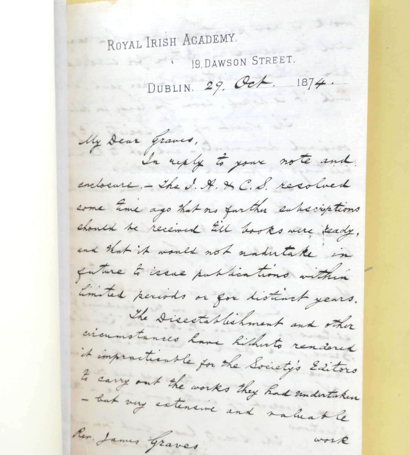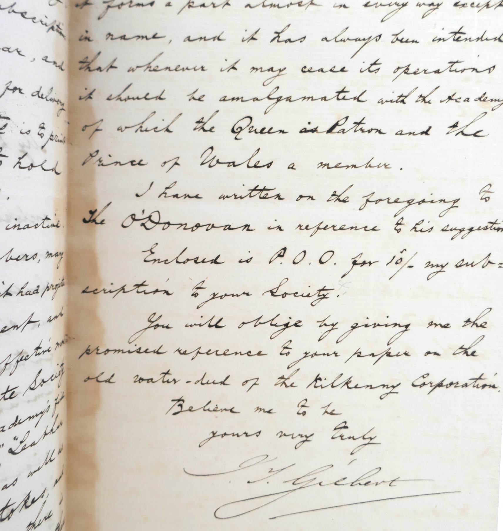 Tipped-in ALS from J.T. Gilbert to the editor, William Reeves. Sir John Thomas Gilbert (1854-1859) was librarian of the Royal Irish Academy for 34 years. The Gilbert Library in Dublin’s Pearse Street is named for him.