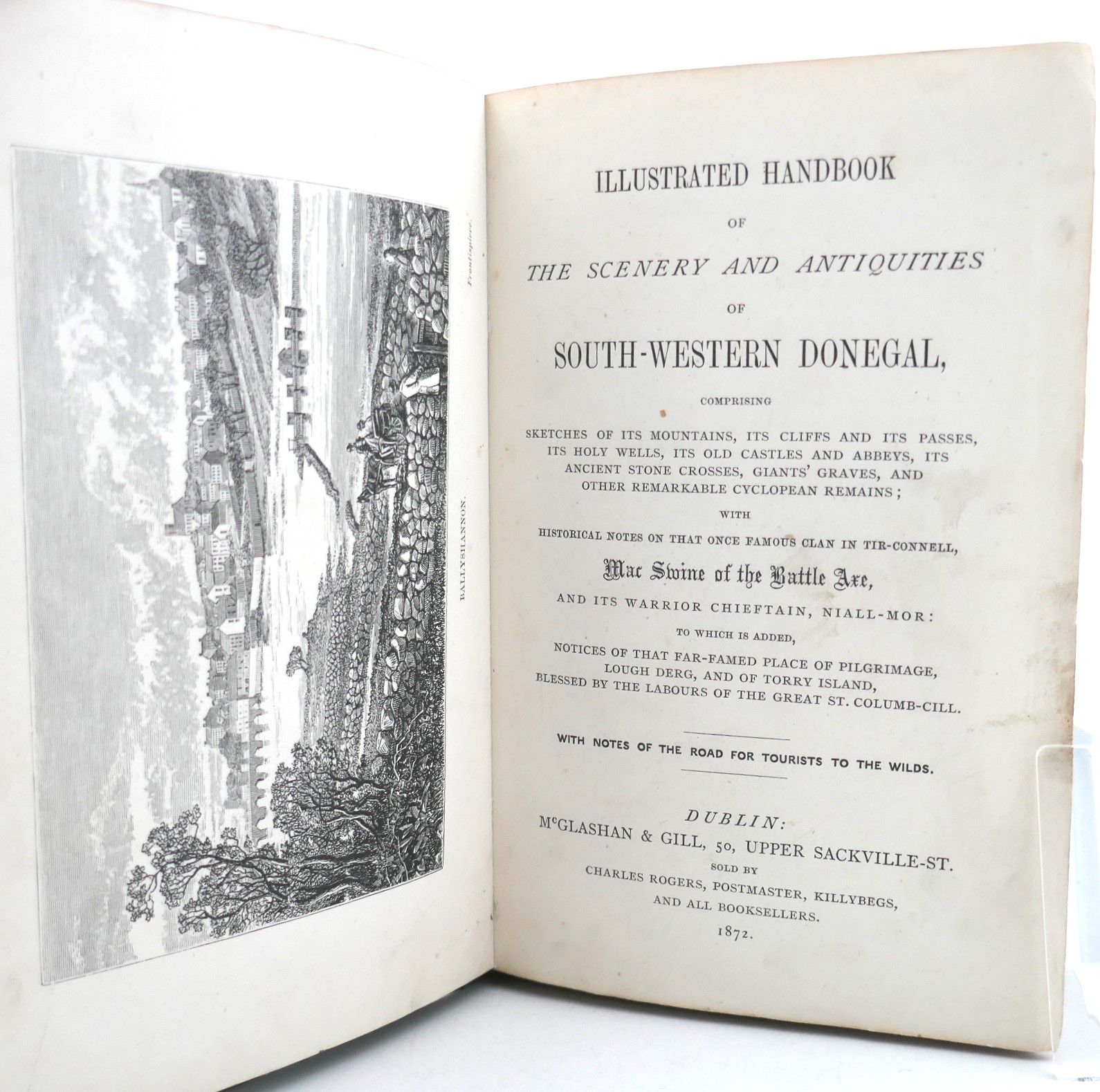 Illustrated Handbook of the Scenery and Antiquities of South-Western Donegal. Dublin: McGlashan & Gil, 1872. First Edition. Pp iv, 128, with 11 plates. Rebound in green cloth boards, original cloth featuring gilt title retained to upper cover. small perforation to inner margins of pages 99-102 (text not affected), otherwise a nice bright copy. Illustrated with eleven plates.