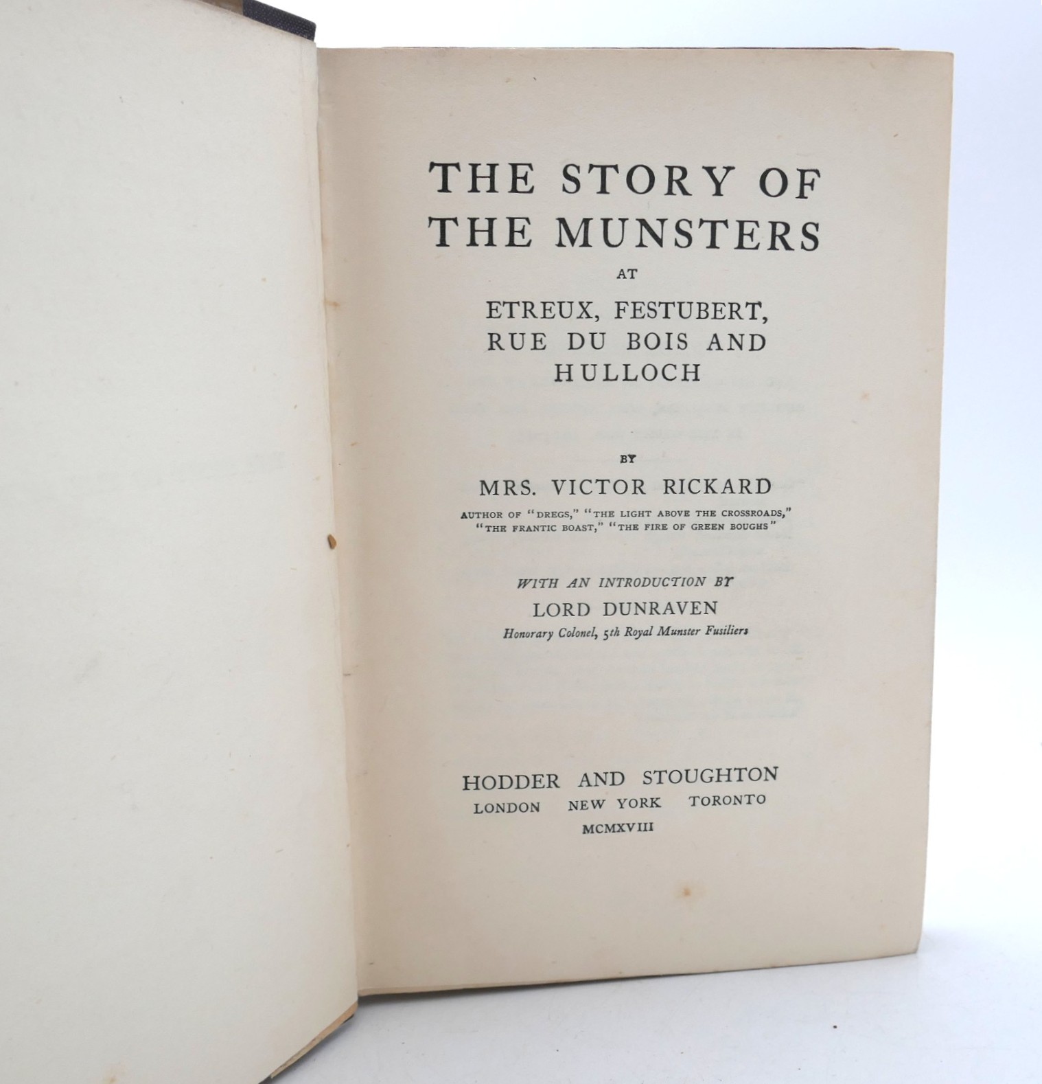 The Story of the Munsters. At Etreux, Festubert and Rue Du Bois. With an Introduction by Lord Dunraven. London: Hodder and Stoughton, 1918. First Edition. Pp, xvi, 116. Publisher’s quarter cloth paper boards, title label to upper cover & spine. Covers lightly scuffed and faded, contents pages in nice bright condition.