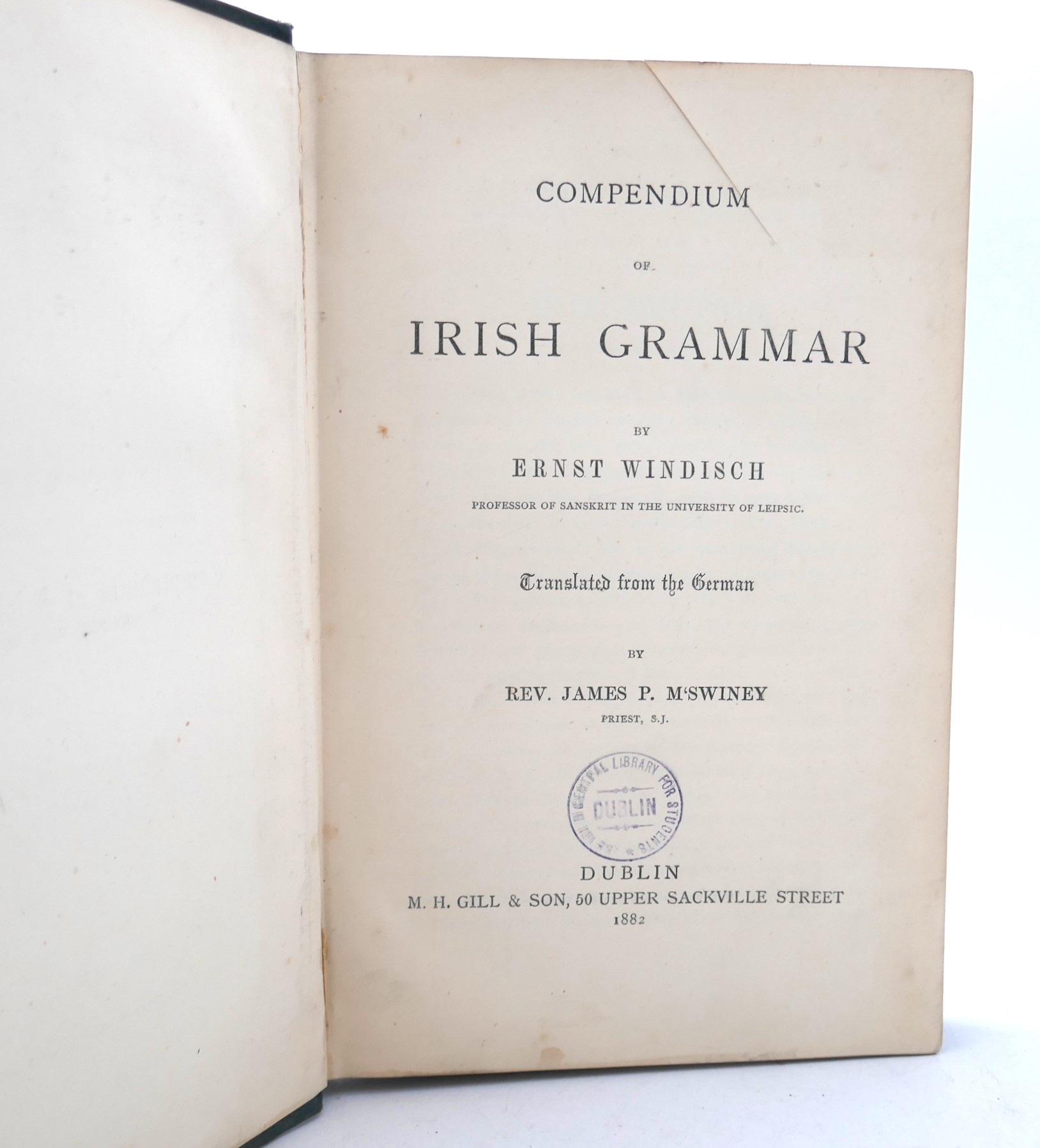 Compendium of Irish Grammar. Translated from the German by Rev. James P. M’Swiney. Dublin: H.M. Gill, 1882. First Edition. Pp xiv, 182. Publisher’s green cloth boards title in gilt to spine. Ex library copy with stamps, small section cut from corner of half-title, otherwise a nice copy.