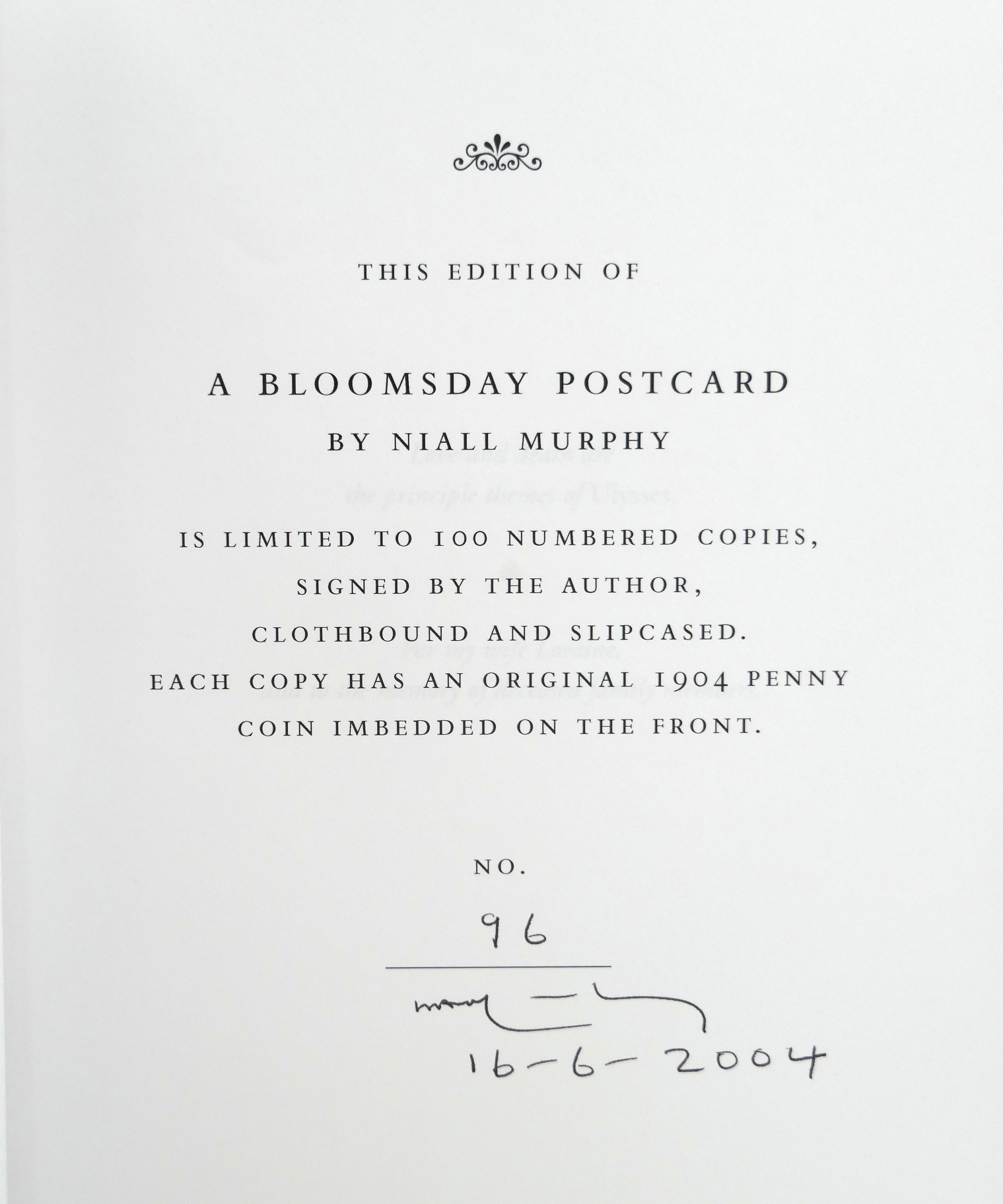 A Bloomsday Postcard. Dublin: Lilliput Press, 2004. Green cloth, lettered in gilt with an original 1904 Penny coin embedded in the front board. Fine as issued housed in publisher’s slipcase.