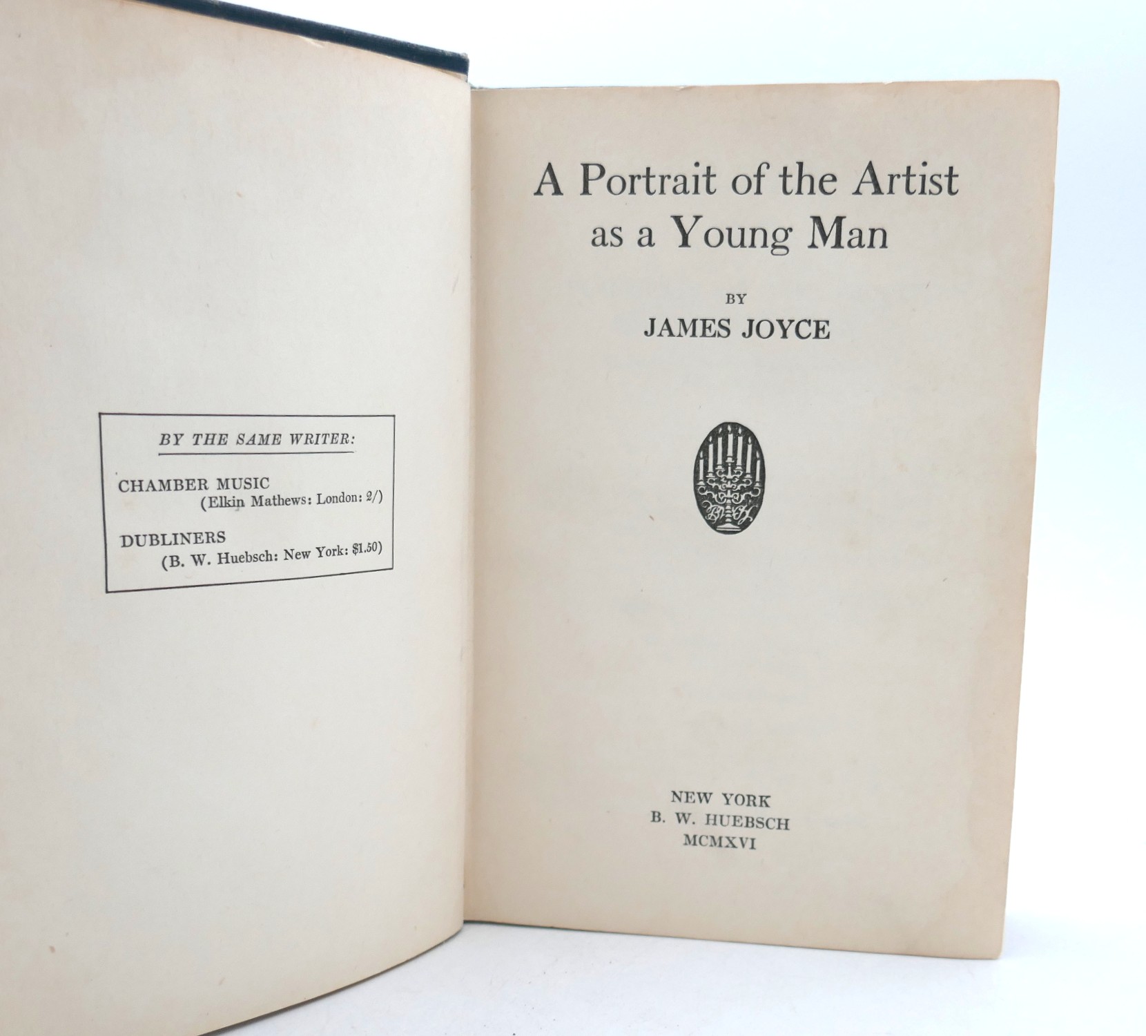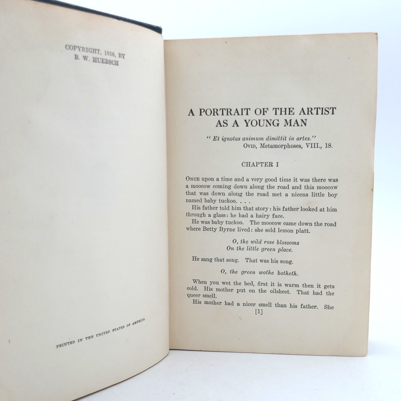 A Portrait of the Artist as a Young Man. New York: B.W. Huebsch, 1916. First Edition. Pp, 299. Original dark blue cloth, title blind embossed on front cover, and gilt stamped on spine. Rubbing along spine, light shelf-wear to boards, contents bright & clean throughout.