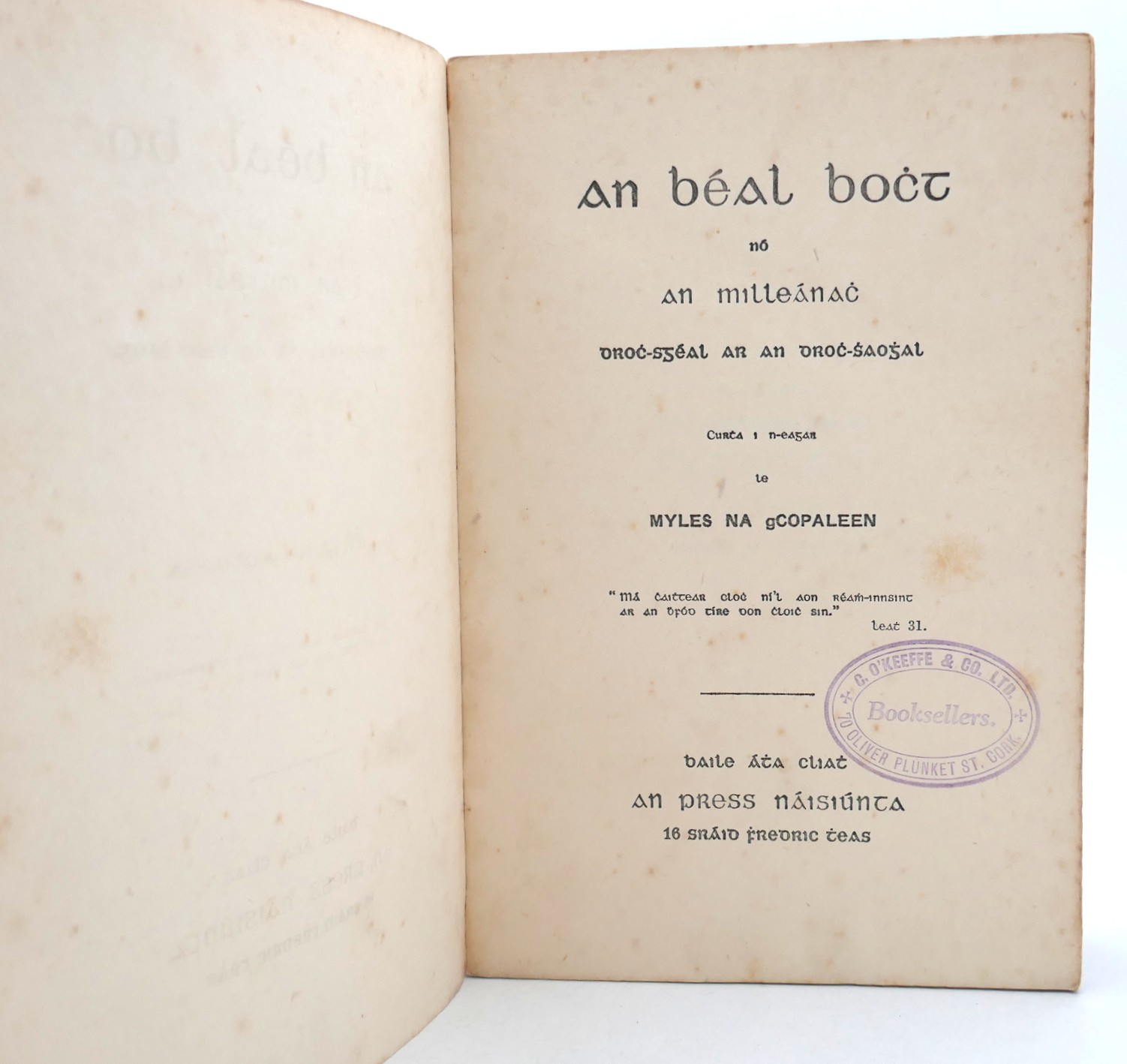 An Beal Bocht. Nó An Milleanach Droch-Sgeal ar an Droch-Shaoghal. Dublin: An Press Naisiunta, 1942. Second Edition. Pp, 111. Publisher’s pictorial card covers & pictorial endpapers by Seán O’Sullivan. Worn along spine & edges, spotting to covers, fore-edges & preliminary leaves; contents in good condition.