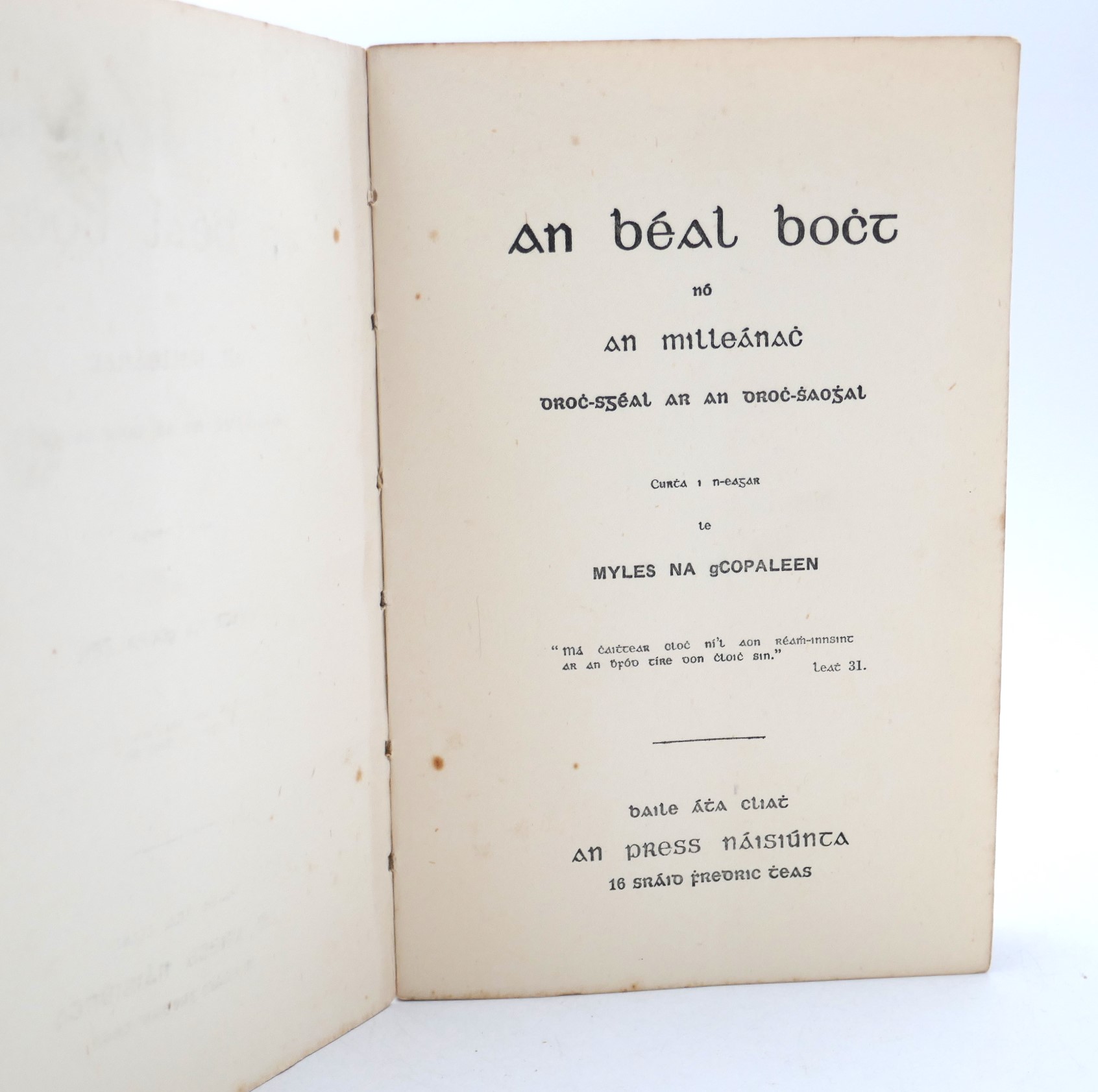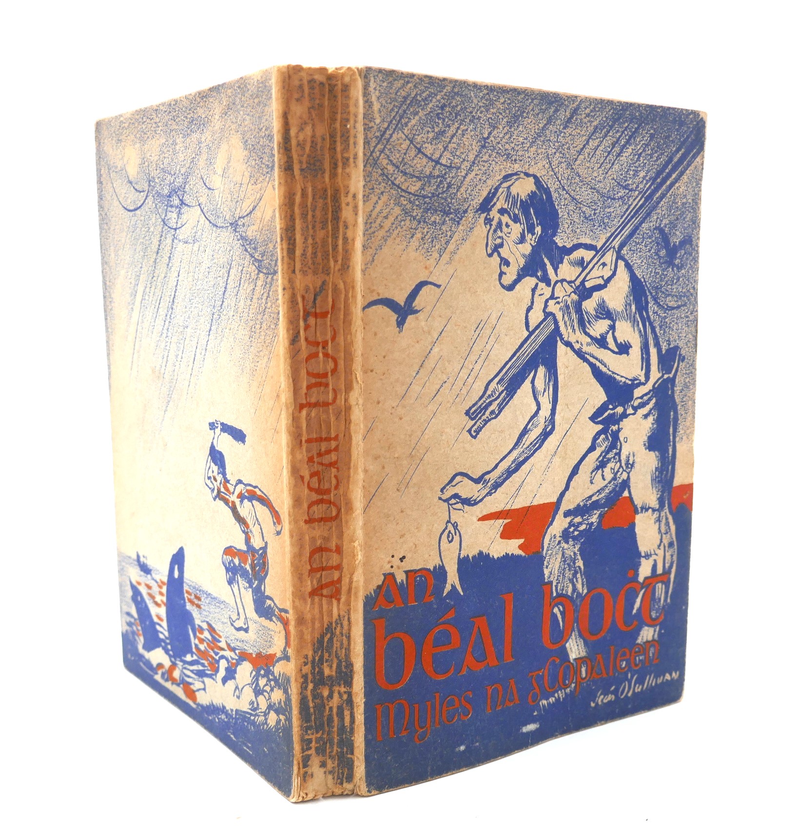 An Béal Bocht. No an Milleanach broch-sgeal ar an droch-shaoghal. Dublin: An Press Naisiunta, 1941. First Edition, Second Issue (with printer’s name on rear endpaper). Pp, 111. Pictorial card covers by Sean O’Sullivan. Minor shelf-wear, but overall a nice bright copy of this fragile publication.