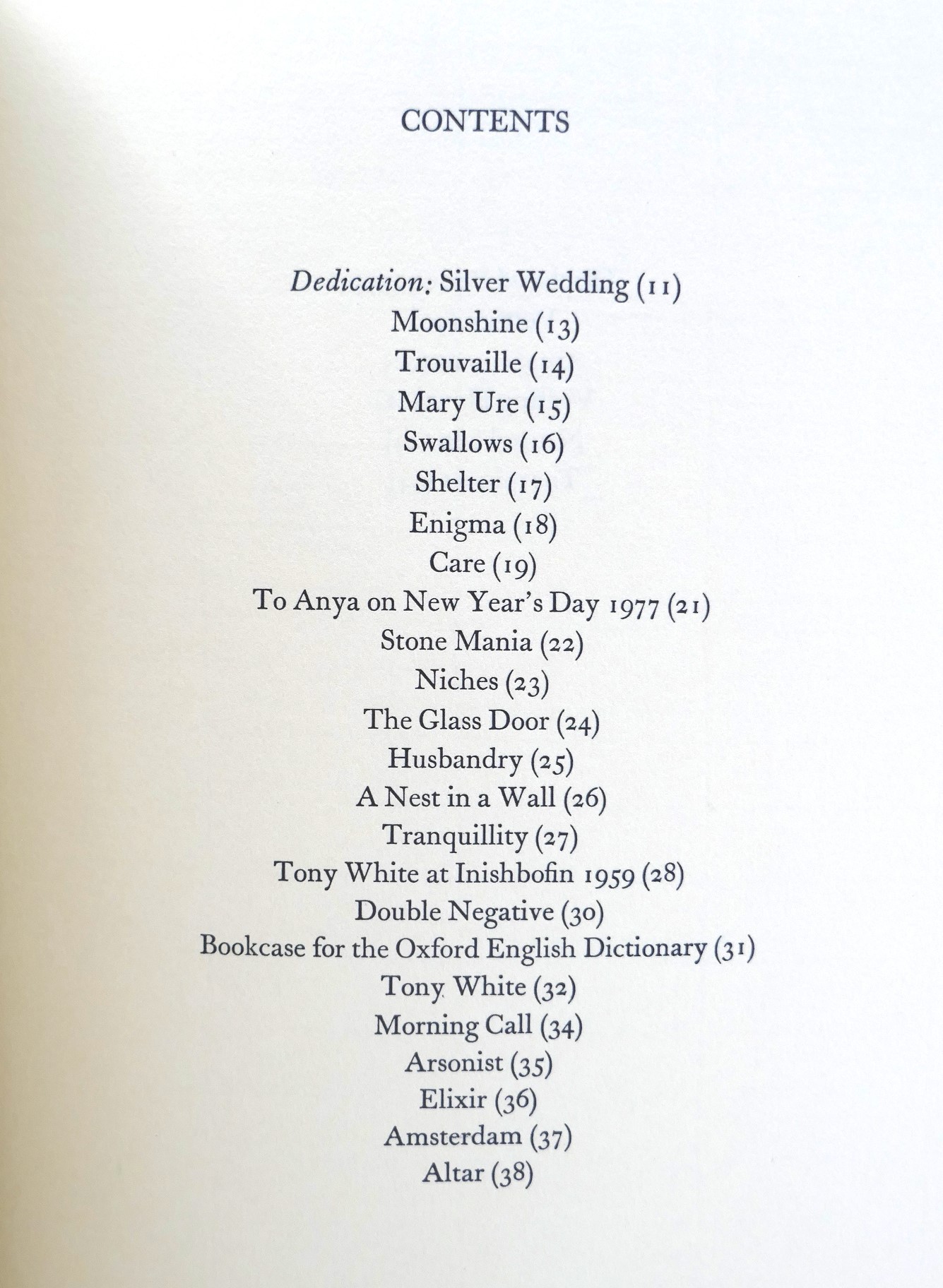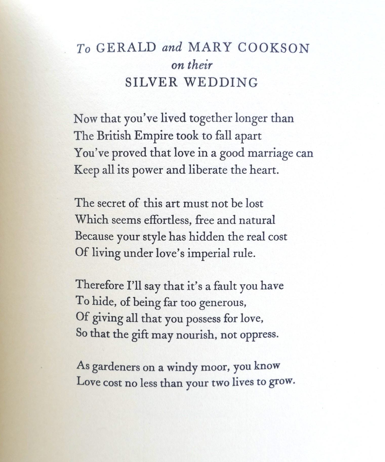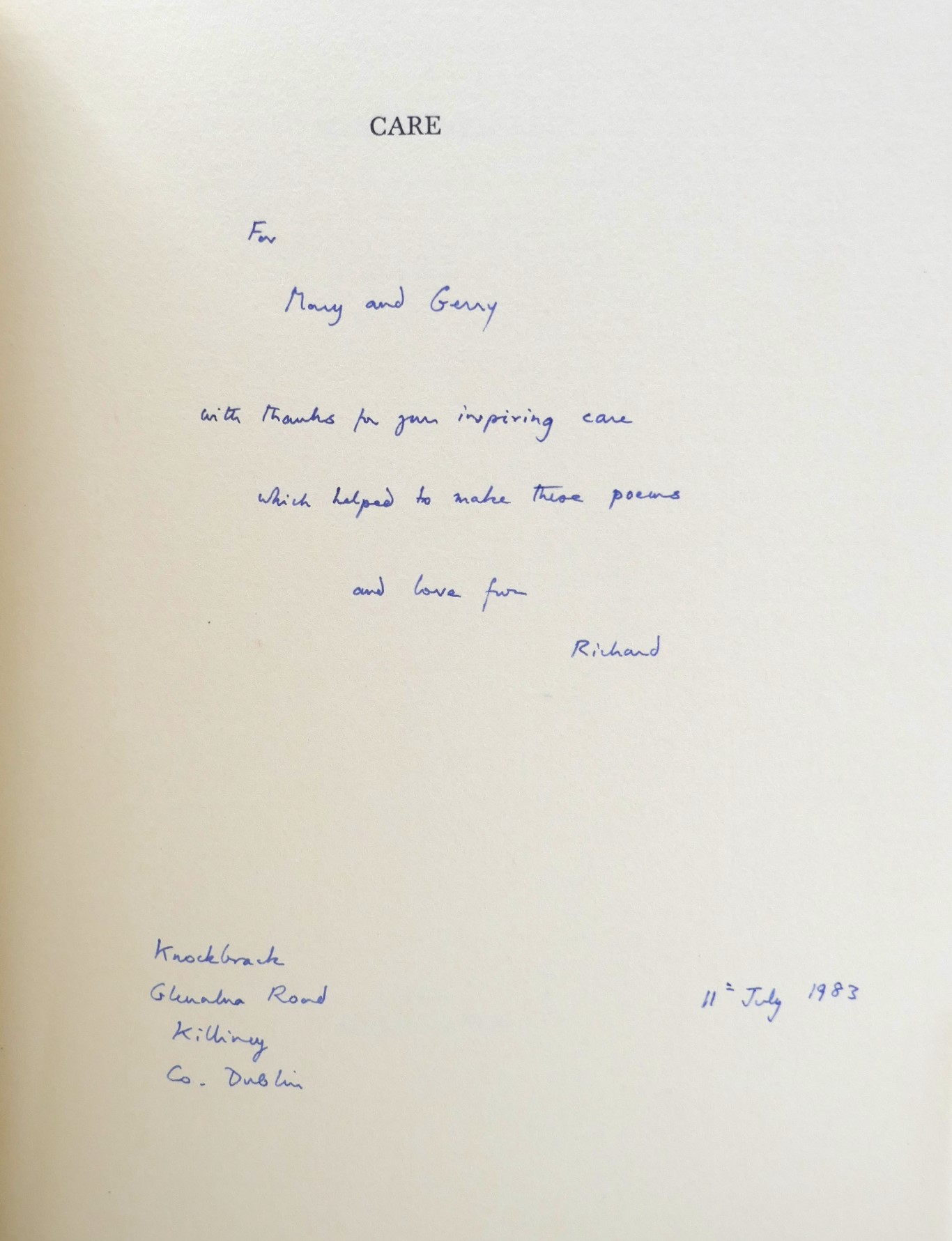 Also inscribed by Murphy on the half-title page: ‘To Mary and Gerry, with thanks for your inspiring care which helped to make these poems and love from Richard, 11th July, 1983.” The first poem is entitled Dedication: Silver Wedding (To Gerald and Mary Cookson on their Silver Wedding).