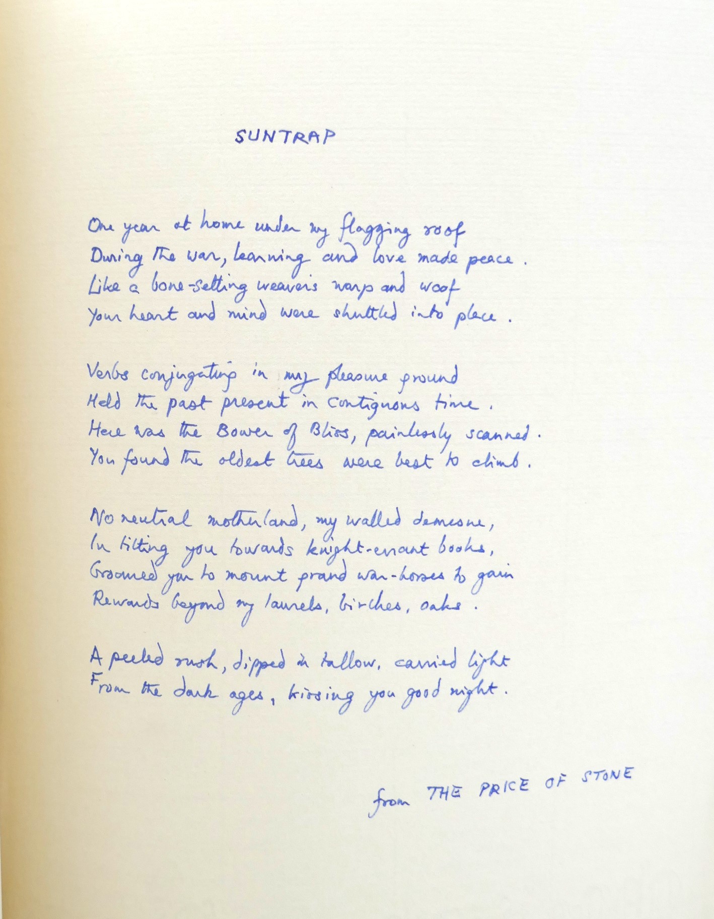 Limited Edition of 200 Copies in total. This copy one of 25 bound thus, and marked ‘Hors Commerce’ with four stanzas in holograph of ‘Suntrap’ (from ‘The Price of Stone) in the Author’s hand to second endpaper.