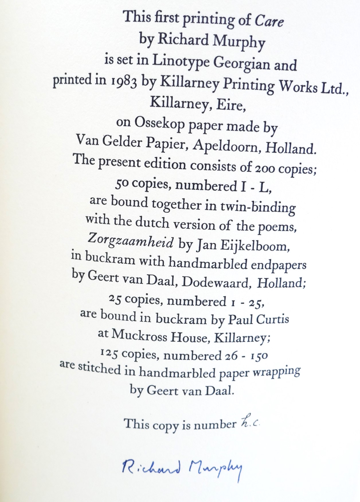 Care. Kilkenny: Cornamona Press, 1983. First Edition, Limited Issue. Bound in twin-binding buckram with hand marbled endpapers by Paul Curtin at Muckross House, Killarney. Housed in publisher’s cloth solander box.