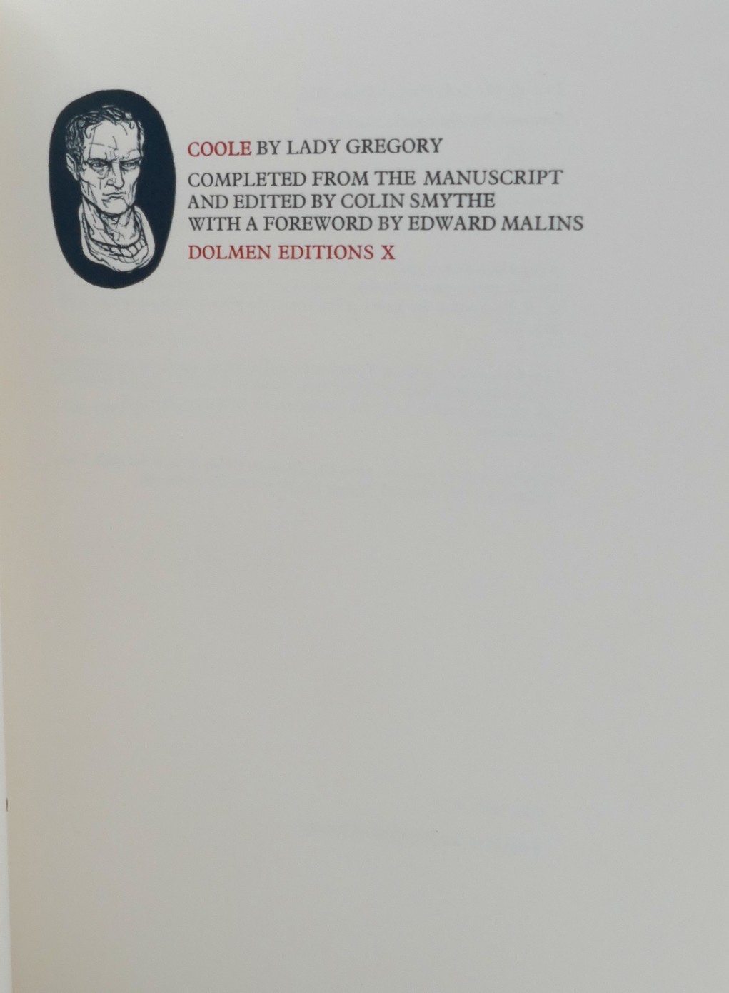 Coole. Completed from the Manuscript and Edited by Colin Smythe, with a Foreword by Edward Mallins. Dublin: Dolmen Press. 1971. Pp, 105. Dolmen Editions X. Quarter linen over paper boards, title lettered in gilt to spine, in publisher’s dust jacket. Shelf-wear to jacket otherwise a very good copy.