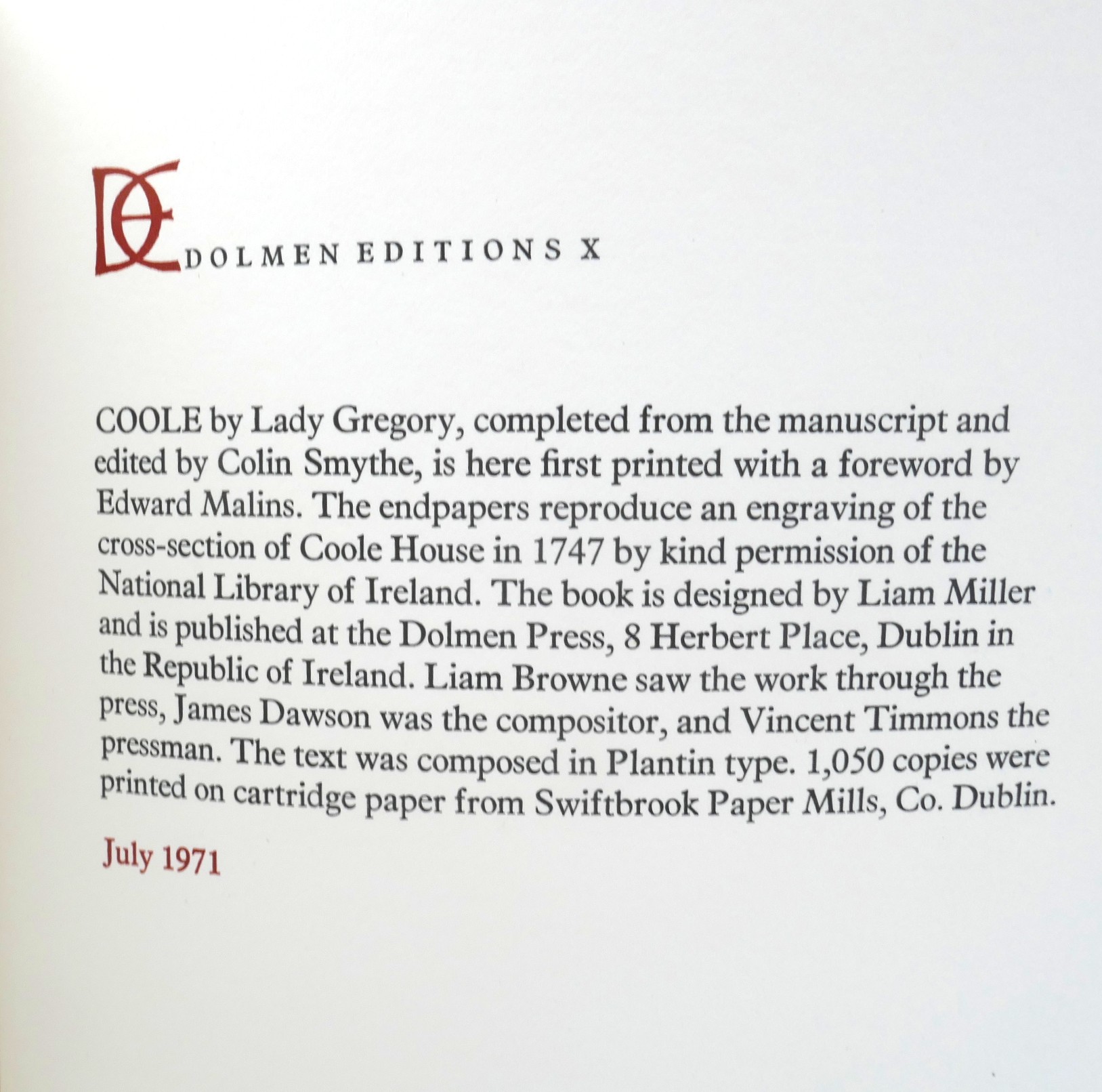 Limited edition of 1050 copies, printed on cartridge paper. Designed by Liam Miller and printed by the Dolmen Press.