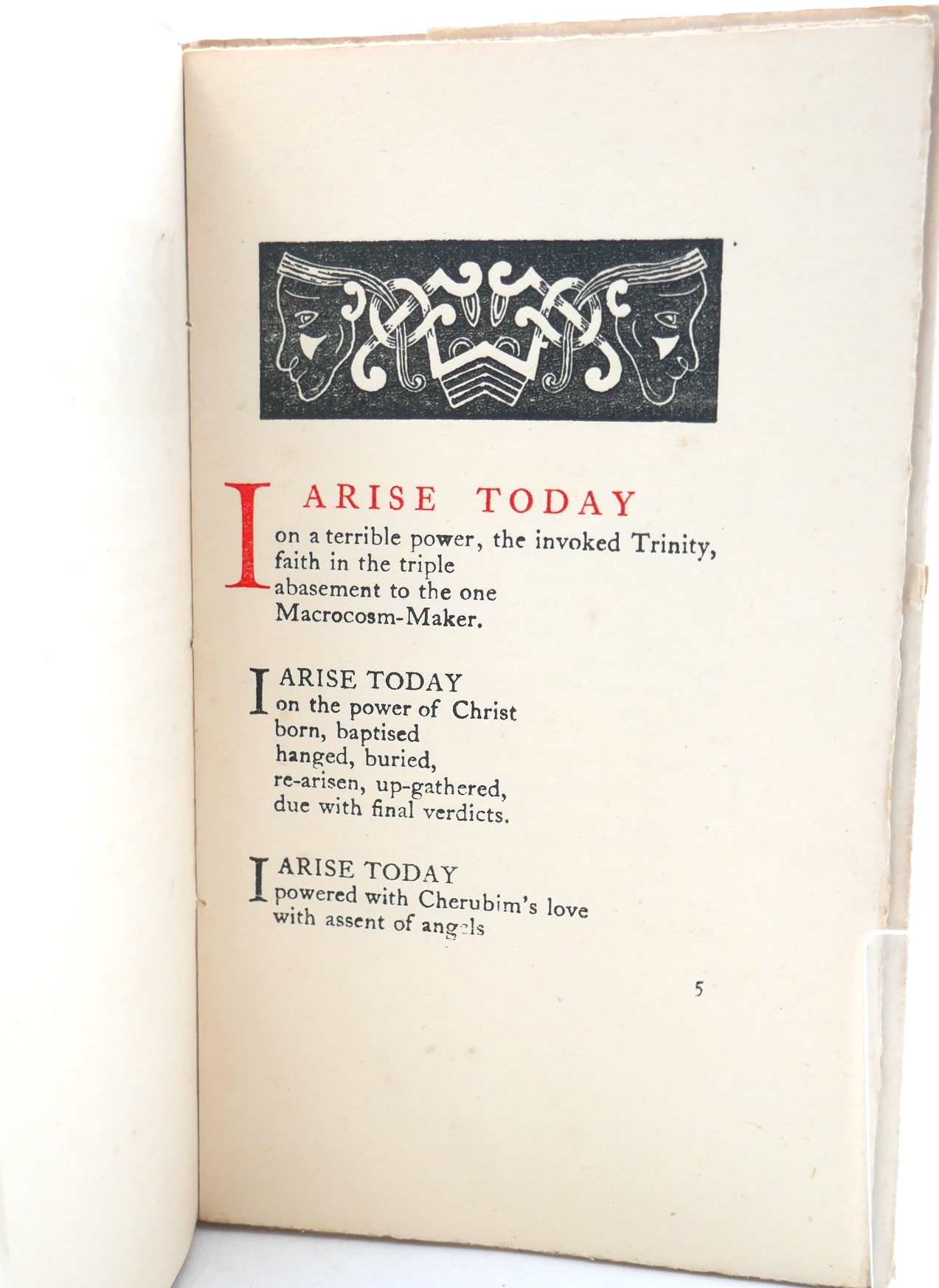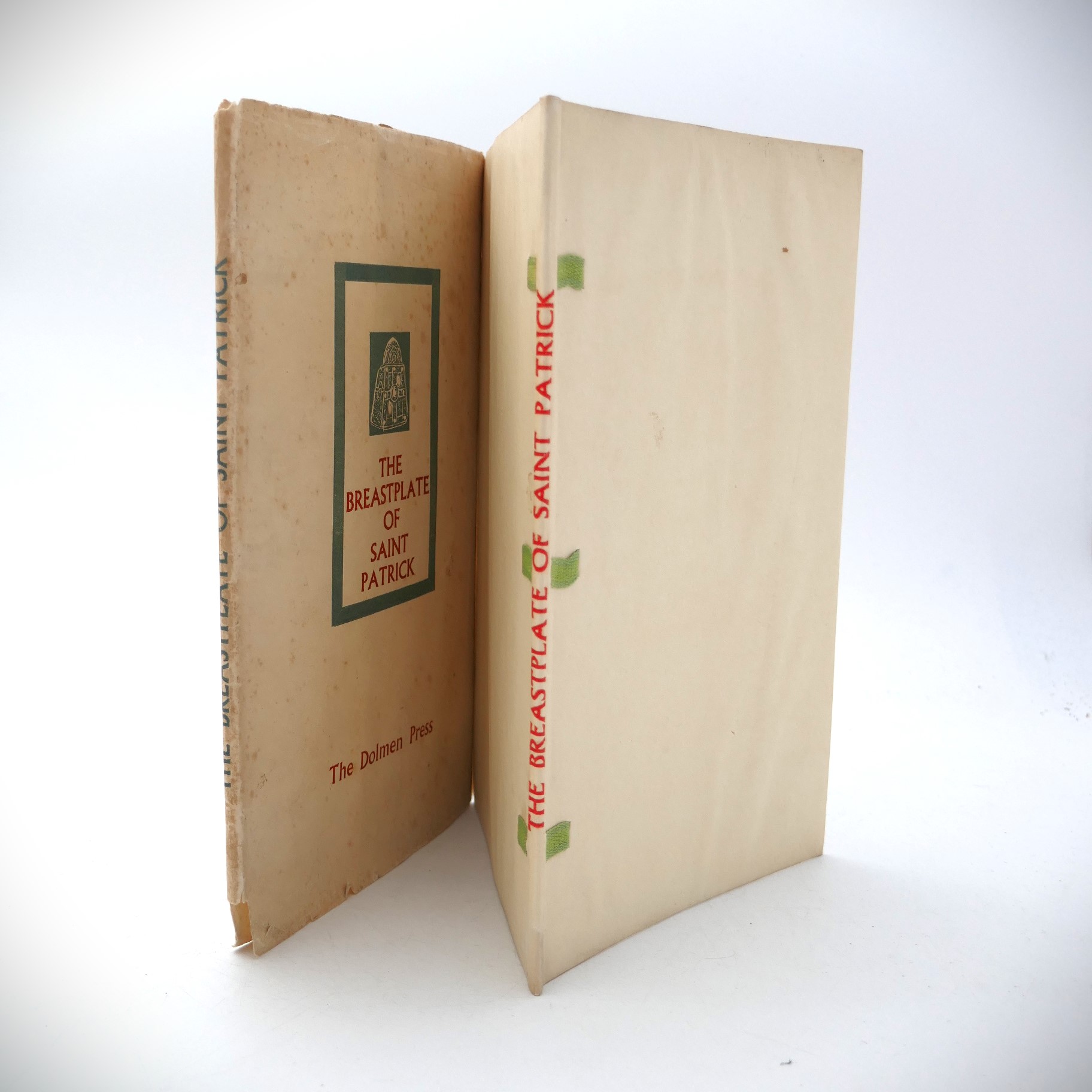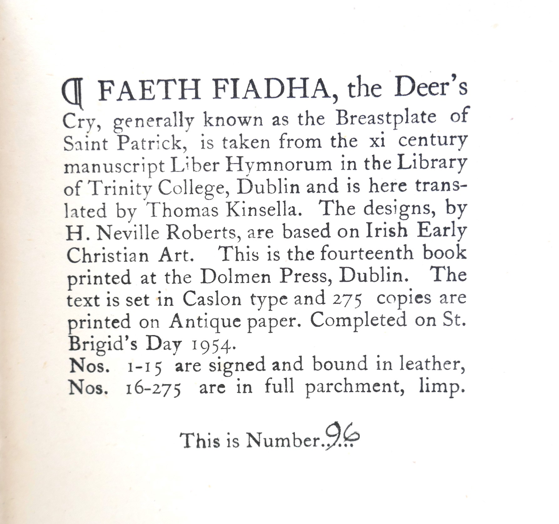 Faeth Fiadha. The Breastplate of Saint Patrick. Translated by Thomas Kinsella from the Irish. Dublin: Dolmen Press, 1954. First Edition, Limited Issue. Bound in full limp vellum, in publisher’s dust jacket. Light fraying to jacket, otherwise a fine bright copy.