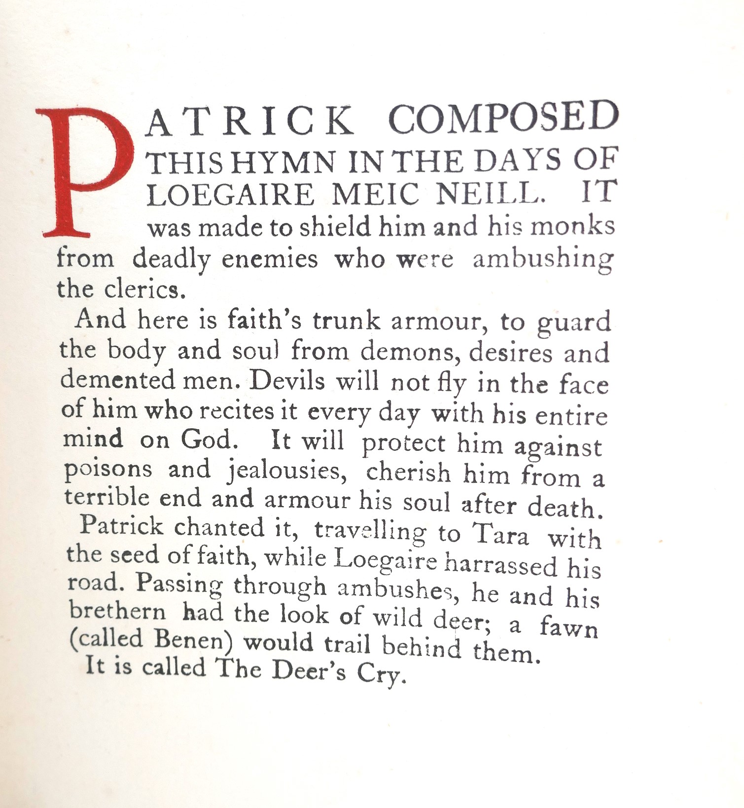 The Breastplate of Saint Patrick (Faeth Fiadha or Deer’s Cry) is taken from the xi century manuscript in the Library of Trinity College, Dublin.