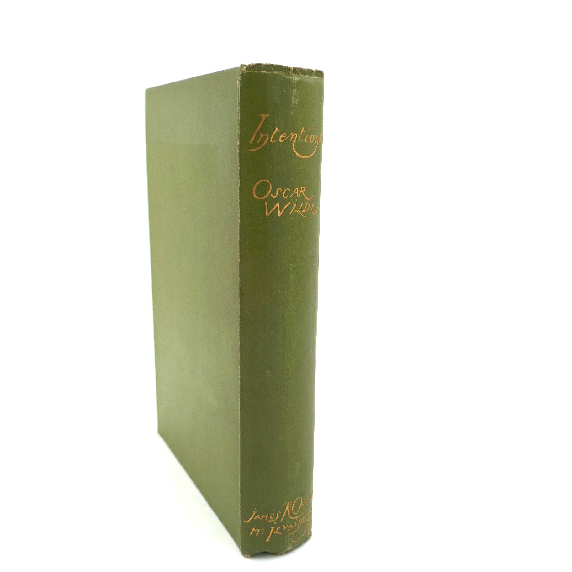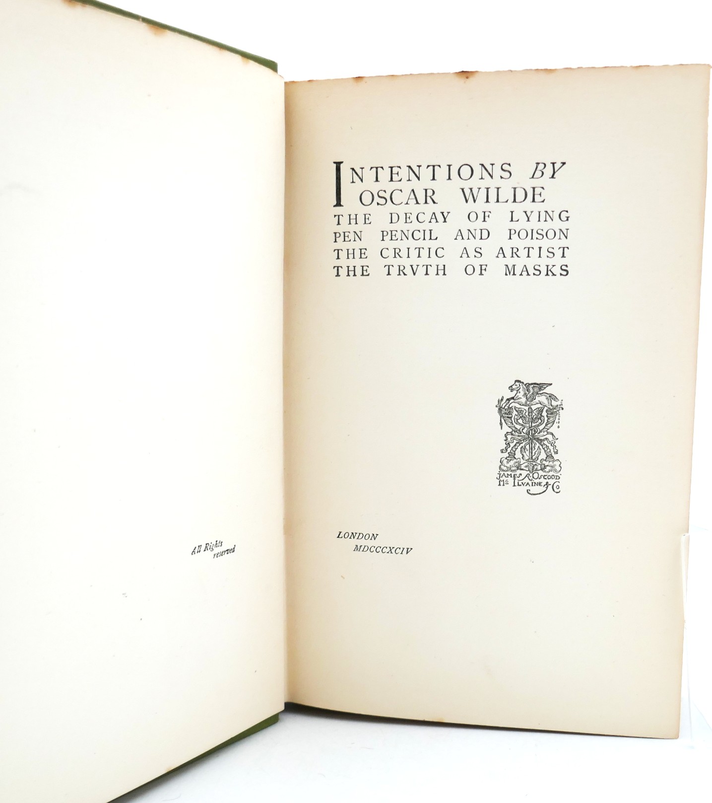Intentions. The Decay of Lying. Pen Pencil and Poison, The Critic as Artist, The Truth of Masks. London: Osgood, McIlvaine and Company, 1891. First Edition. Pp, 258. Original smooth light green cloth, title in gilt to upper cover and spine. Light shelf-wear to boards, small tear to tail of spine, contents in excellent condition throughout.