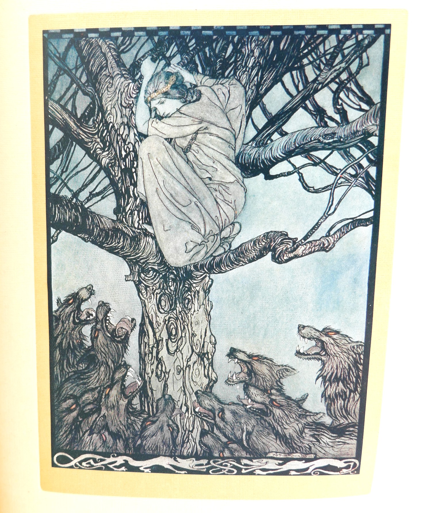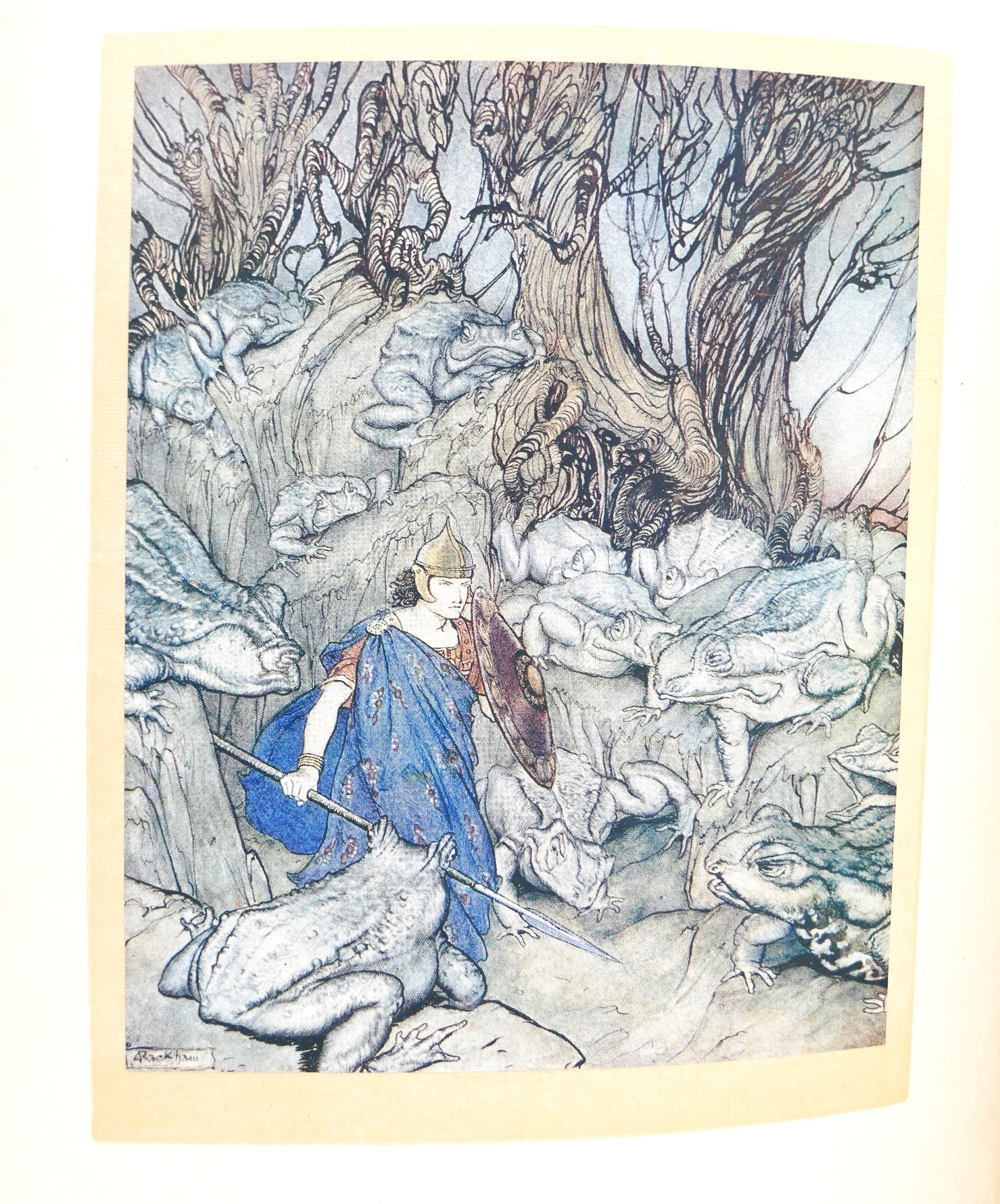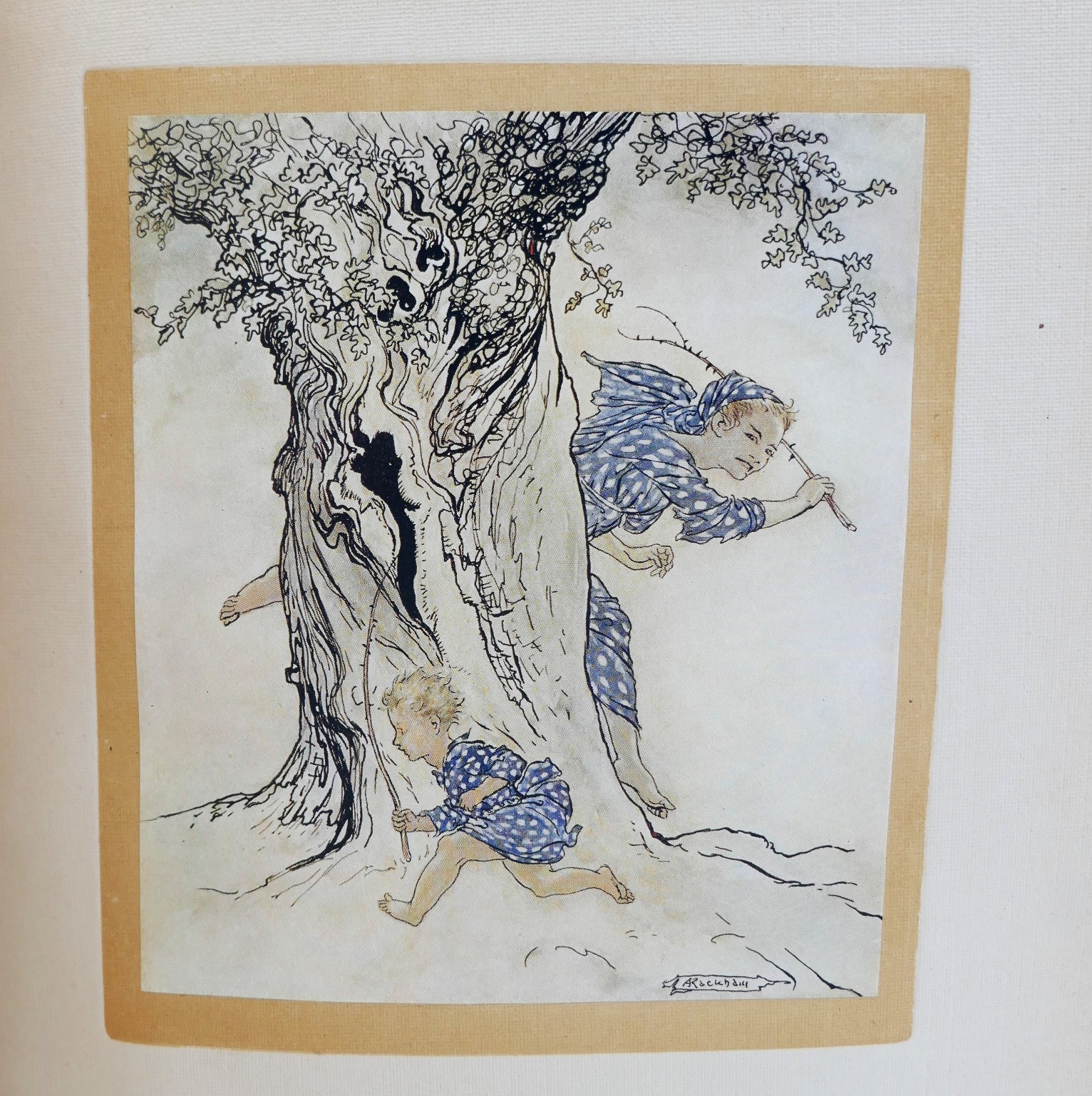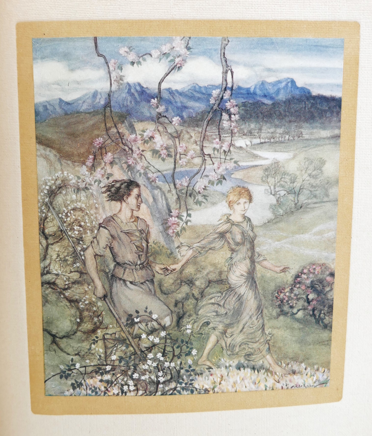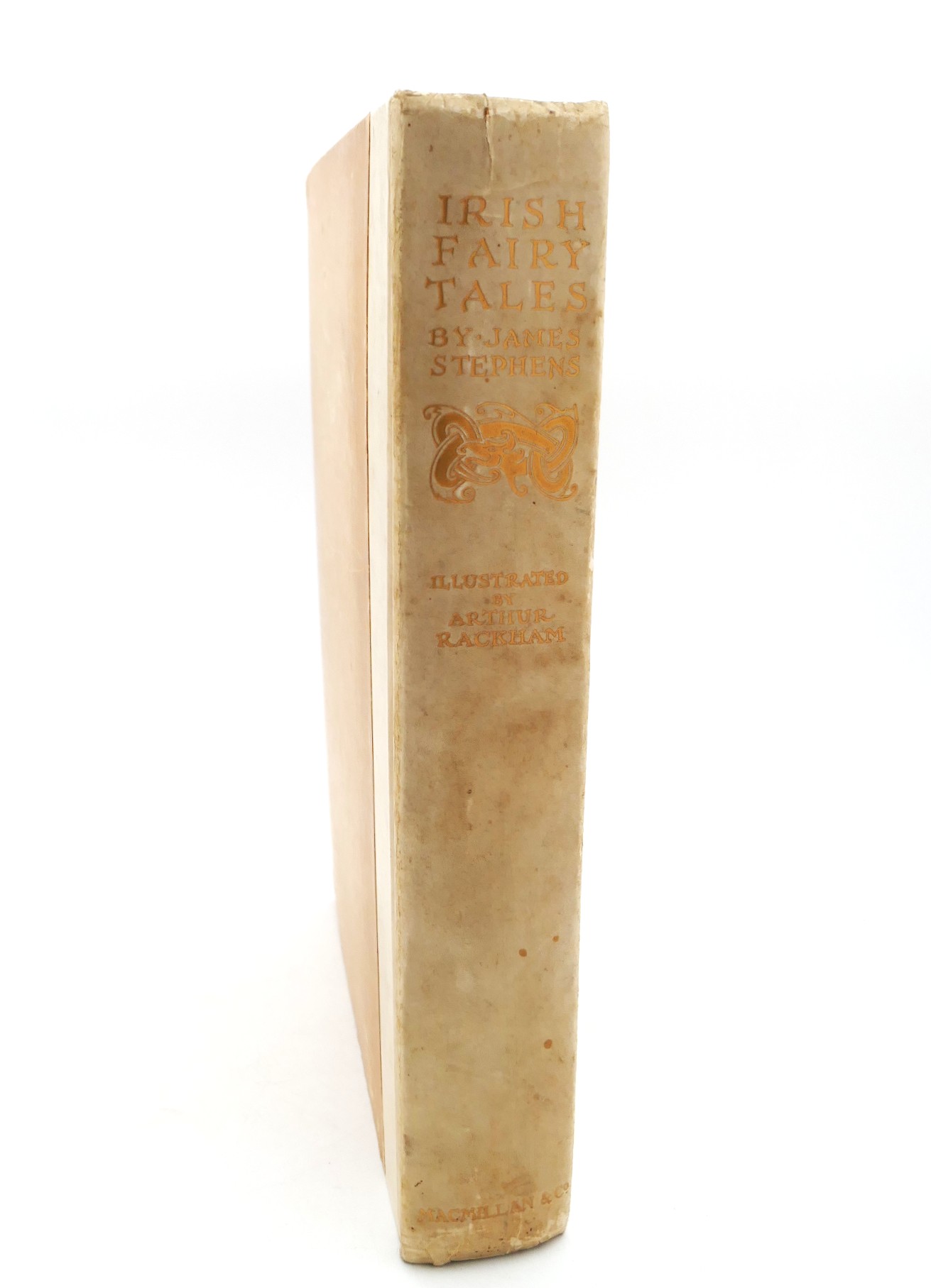Irish Fairy Tales. London: Macmillan & Co., 1920. First Edition, Limited Issue. Sixteen Coloured Plates and other Illustrations by Arthur Rackham. Publisher’s quarter vellum over parchment boards, lettered and pictorially decorated in gilt on both upper cover and spine. Scuff marks to covers, ownership name to endpaper, contents in nice bright condition.