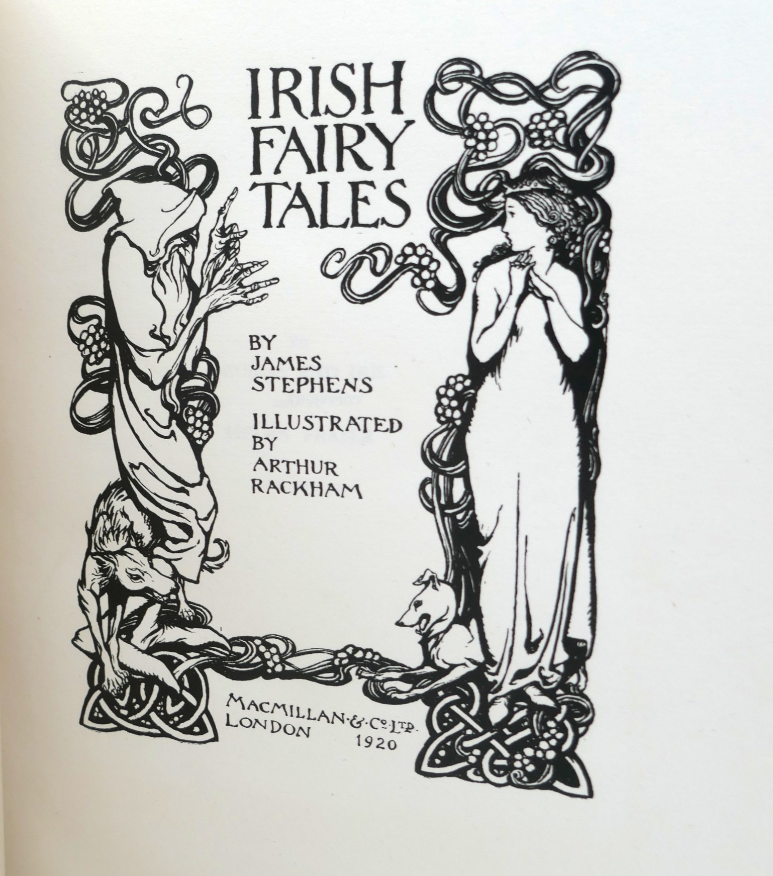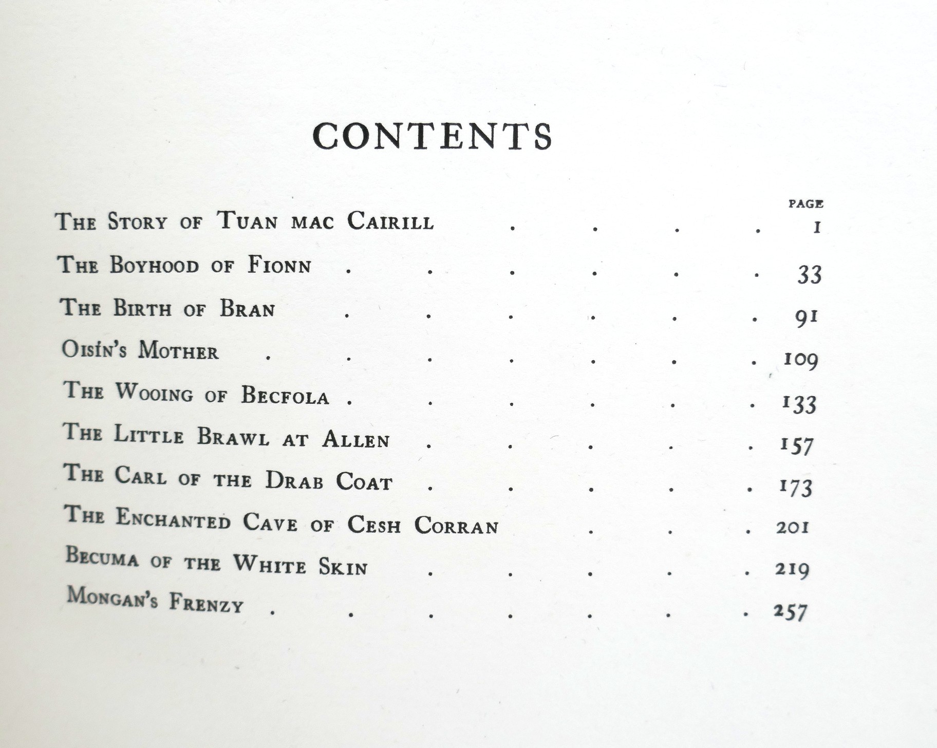 Stephens’ collection of Irish Fairy Tales includes The Story of Tuan Mac Cairill, The Boyhood of Fionn, The Birth of Bran, Oisin’s Mother, The Wooing of Becfola, The Little Brawl at Allen, The Carl of the Drab Coat, The Enchanted Cave of Cesh Corran, Becuma of the White Skin, and Mongan’s Frenzy.