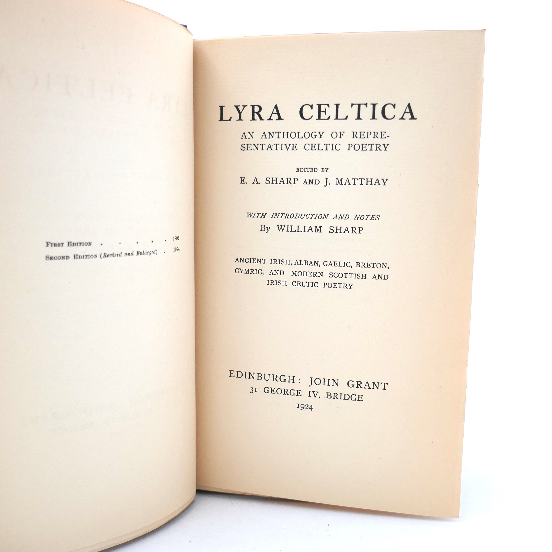 Lyra Celtica. An Anthology of Representative Celtic Poetry. With an Introduction and Notes by William Sharp. Second Edition, Revised and Enlarged. Edinburgh: John Grant, The Celtic Library, 1924. Pp (2), li, (1), 450. Blue cloth, title and design blind embossed to upper cover, in gilt on spine with the top edges in gilt. A nice bright copy.