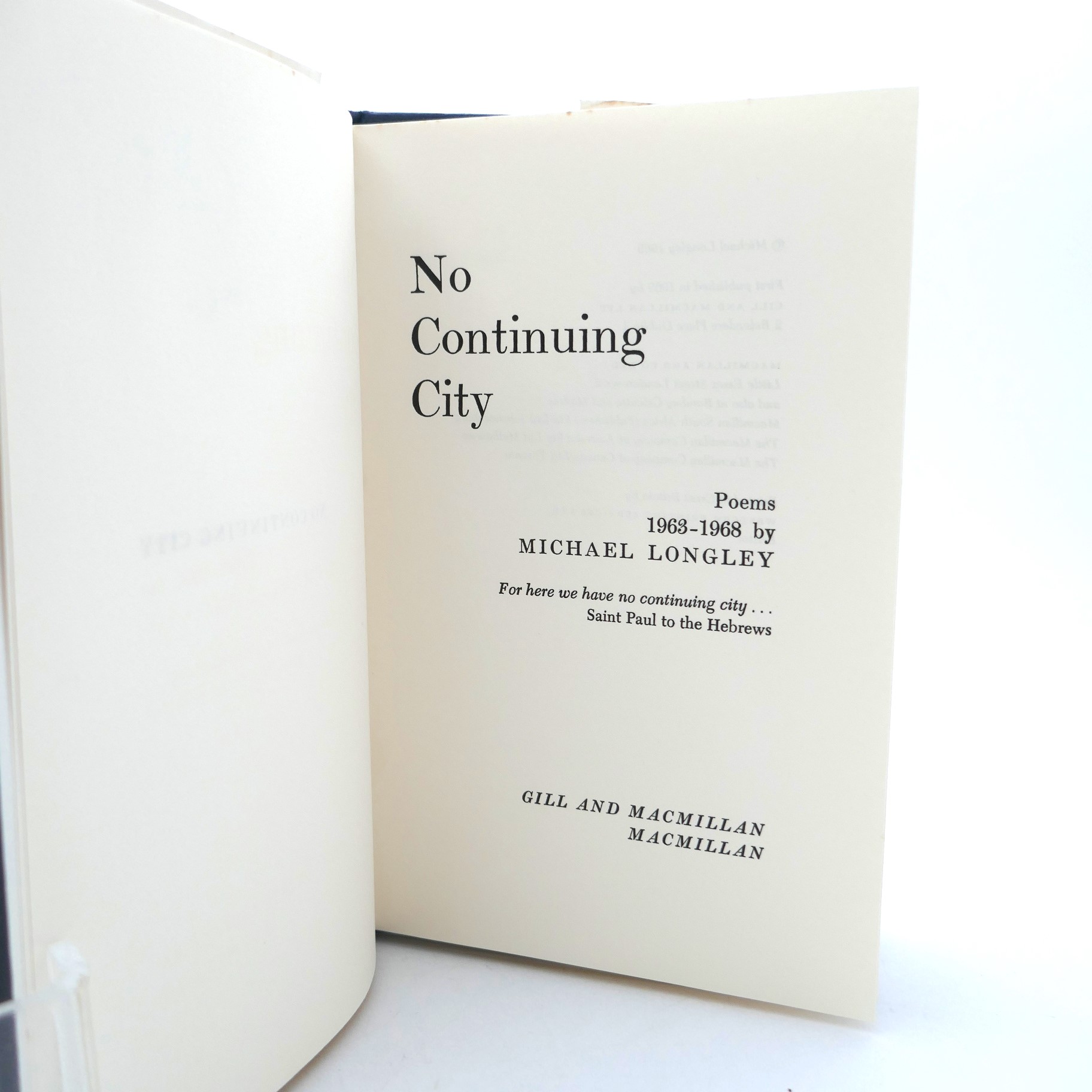 No Continuing City. London: Macmillan, 1969. First Edition. Blue cloth boards, title lettered in whit to spine, in publishers dust jacket. Jacket lightly scuffed, a few minor spots to endpapers, otherwise a nice bright copy.