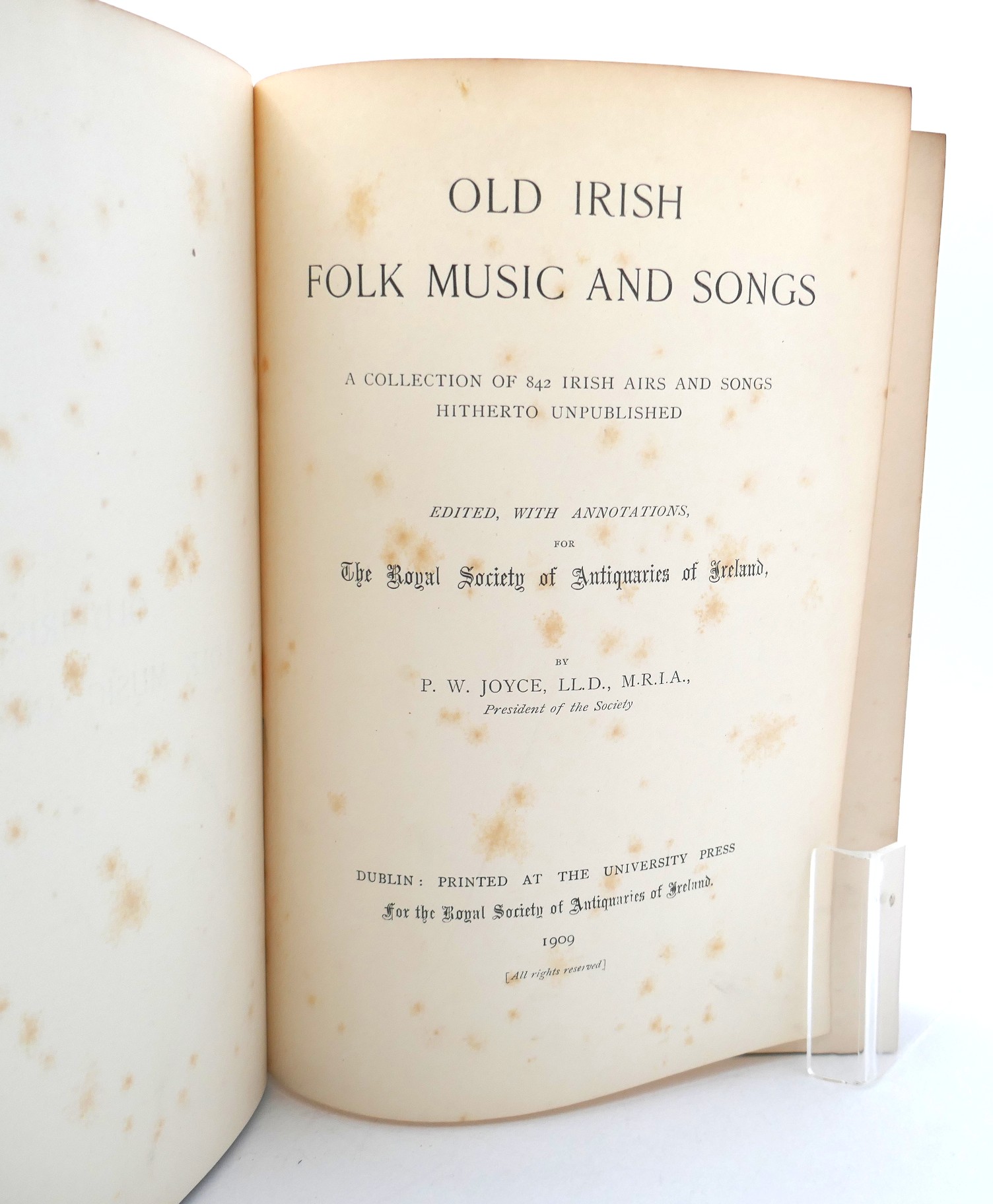 Old Irish Folk Music and Songs. A Collection of 842 Irish Airs and Songs Hitherto Unpublished. Edited, with Annotations , for The Royal Society of Antiquaries of Ireland. Dublin: University Press, 1909. First Edition. Pp xxxvi, 408, [4]. Publisher’s olive green cloth, tiled in gilt on front cover and spine, with Celtic Crosses and design on front cover. A nice bright copy.