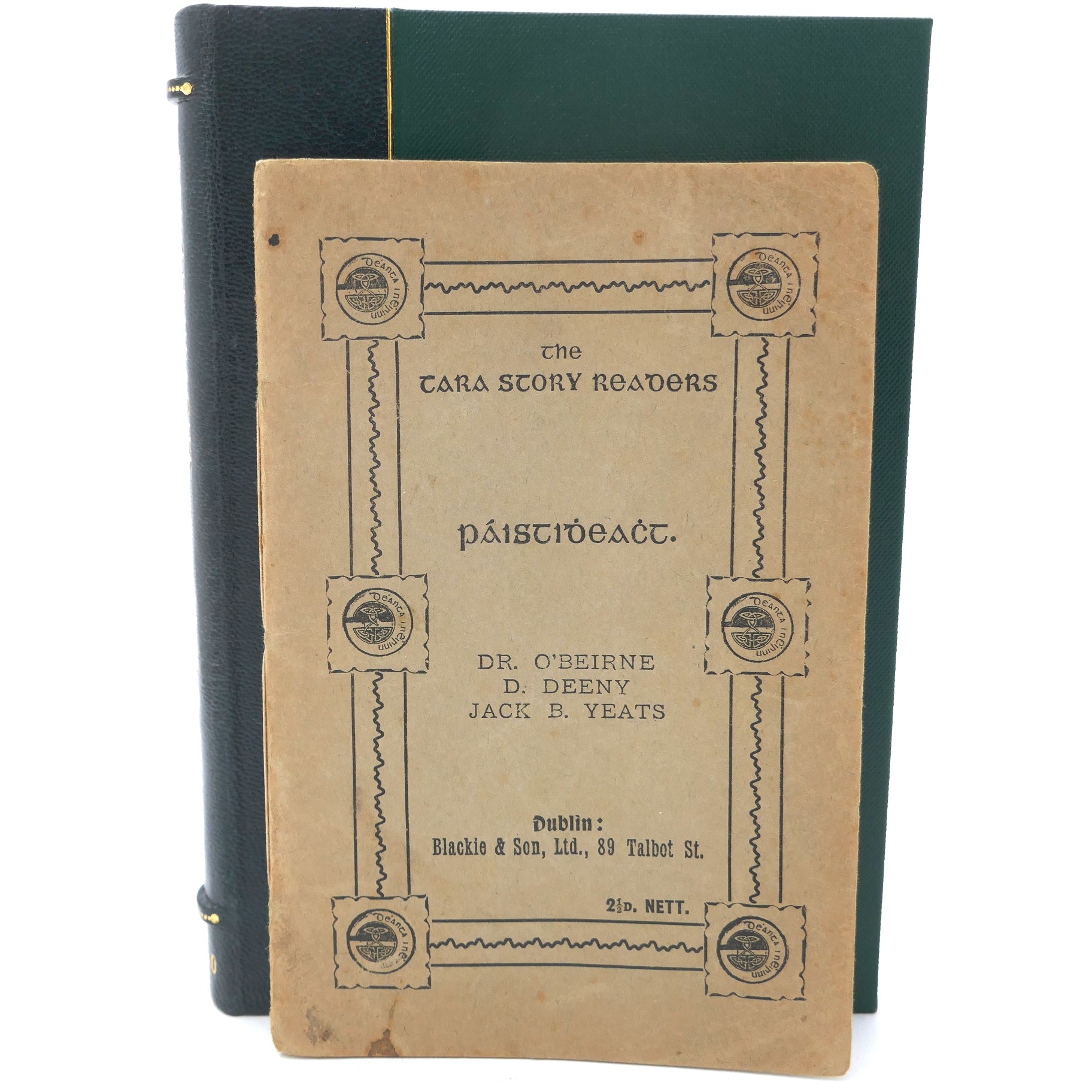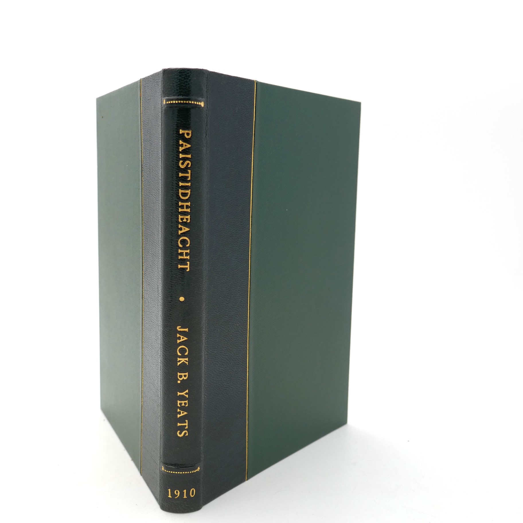 Páistidheacht. Séamus Ó Beirn do ċum agus Domhnall Ua Duibhne do Chuir i n-Eagar. Dublin: Blackie & Son, [1910]. First Edition. Pp 39. Publisher’s green wrappers lettered in black within a Celtic boarder design. Neat pencil annotations throughout the text, otherwise a very good copy on this fragile item. Housed in quarter morocco solander box.