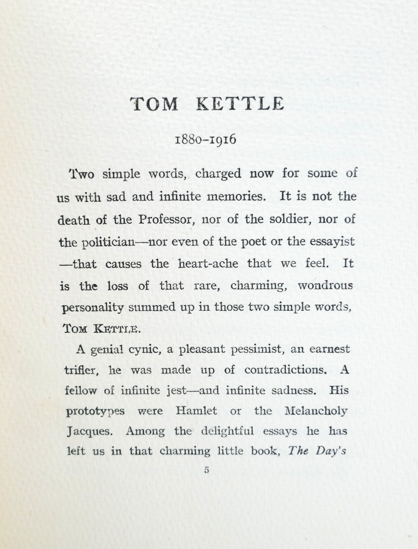 Tom Kettle (1880-1916) – Irish Patriot, Essayist, Poet, served on the western front during the Great War, where he died in September 1916.
