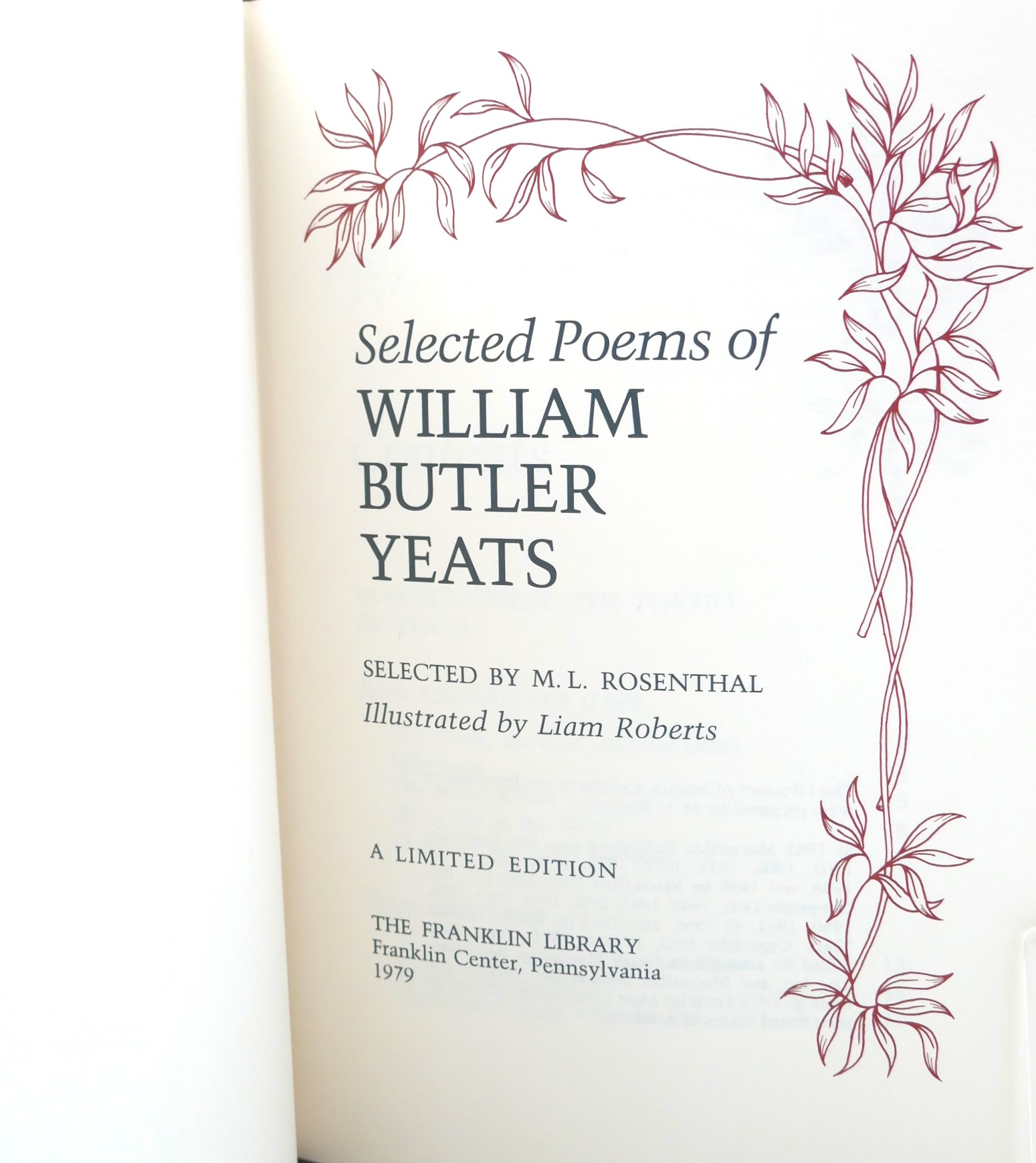 Selected Poems of William Butler Yeats. Selected by M.L. Rosenthal. Illustrated by Liam Roberts. Pennsylvania: The Franklin Library, 1979. Limited Edition. Pp, 300 all edges gilt. Publisher’s full leather boards, spine elaborately decorated in gilt. A fine bright copy.