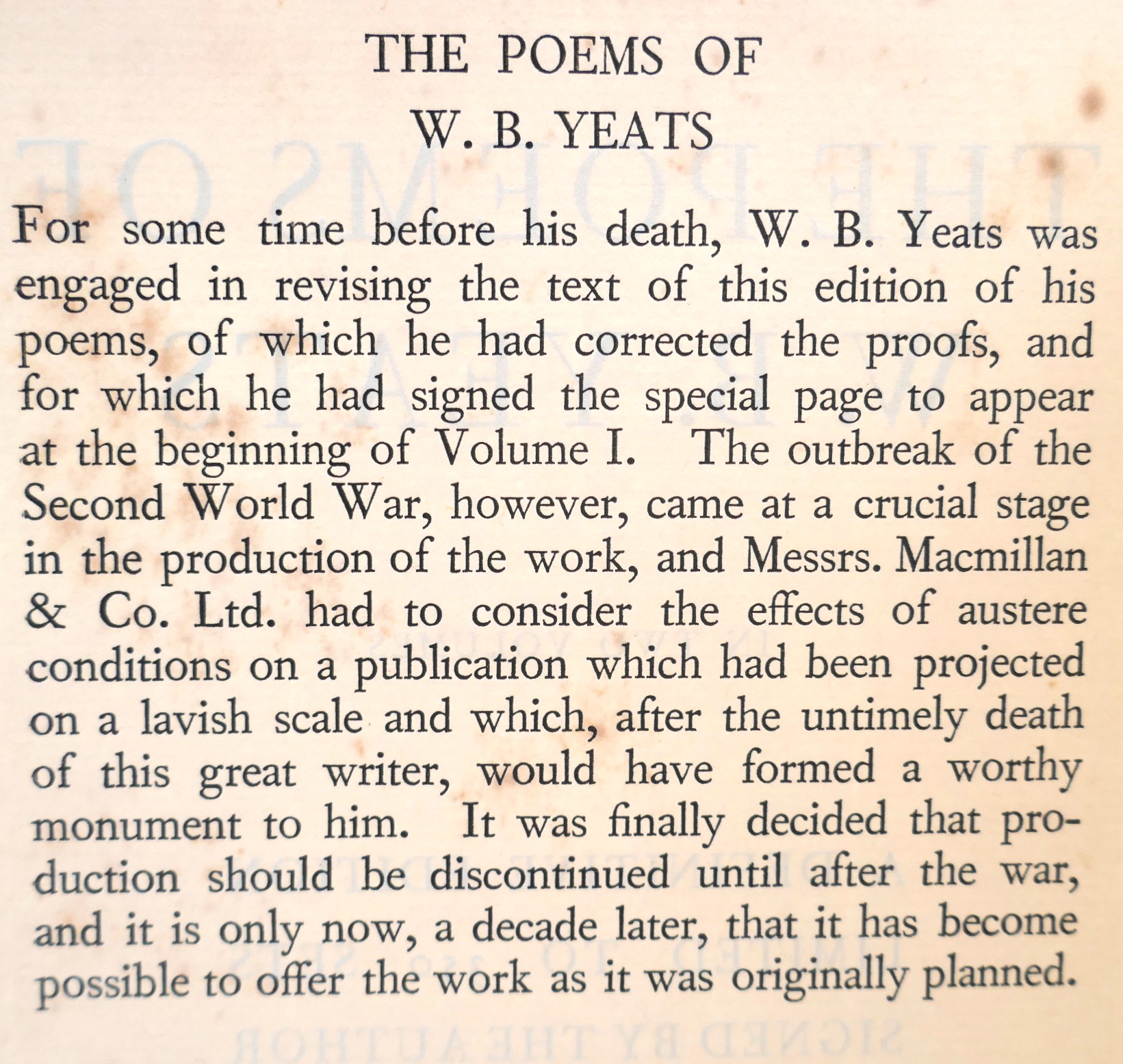 From the time before his death Yeats was engaged in revising the text of this edition of his poems, of which he had corrected the proofs, and for which he had signed the special page to appear at the beginning of volume one. However with his death in 1939, and the outbreak of war later that year, Macmillan shelved the project and it was not until 1949 that the edition was issued.