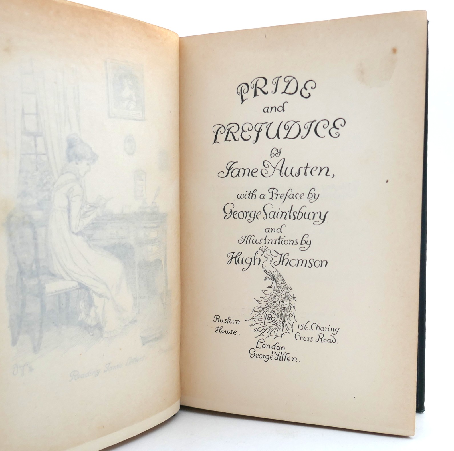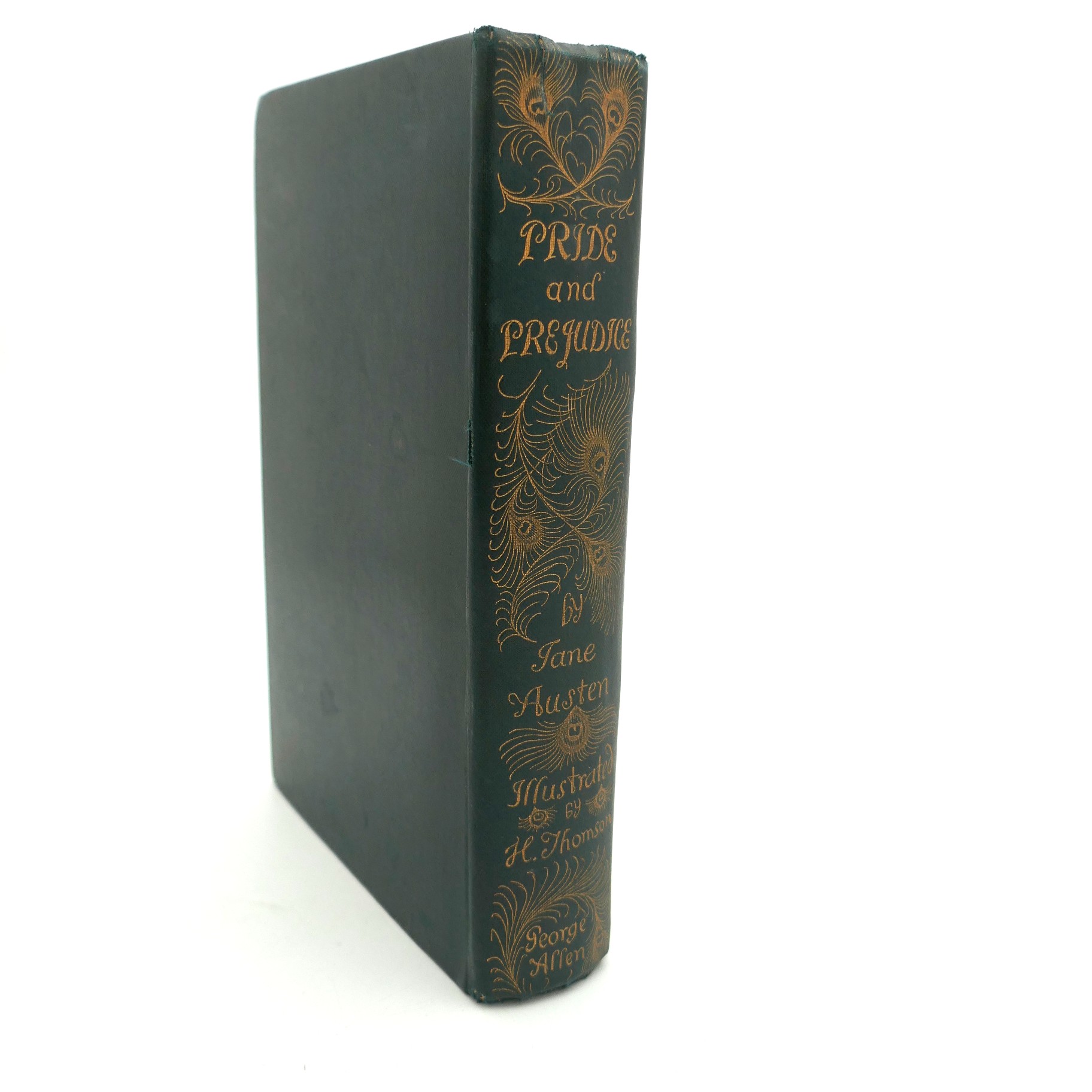 Pride and Prejudice. Illustrated by Hugh Thomson. With a Preface by George Saintsbury. London: George Allen, 1895. First Edition, Second Issue. Pp xxvii, 476, all edges in gilt. Publisher’s green cloth boards with spectacular gilt peacock design to upper board and spine. Paper silhouettes pasted to front endpapers with pen & ink drawings pasted to second endpapers; overall a pleasing copy of this iconic edition.
