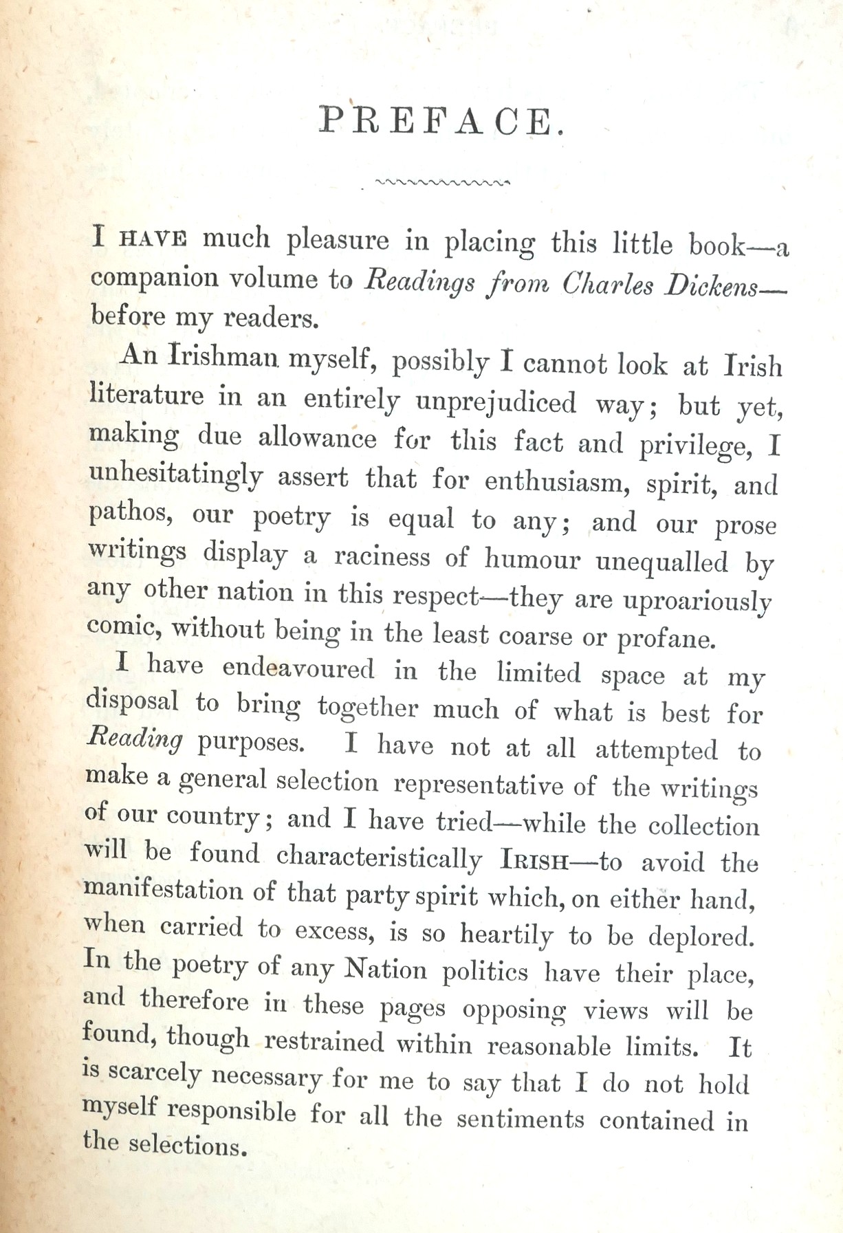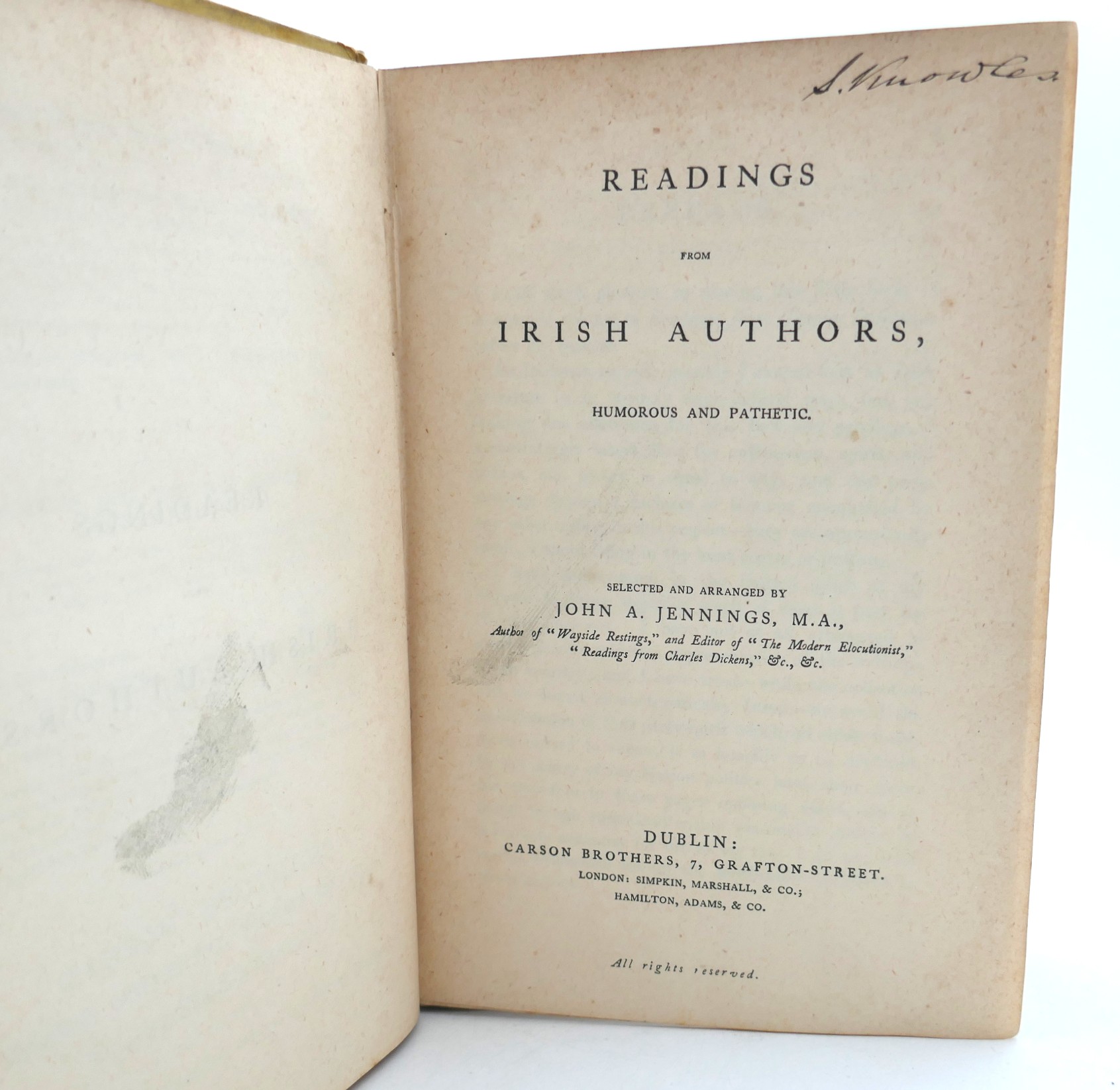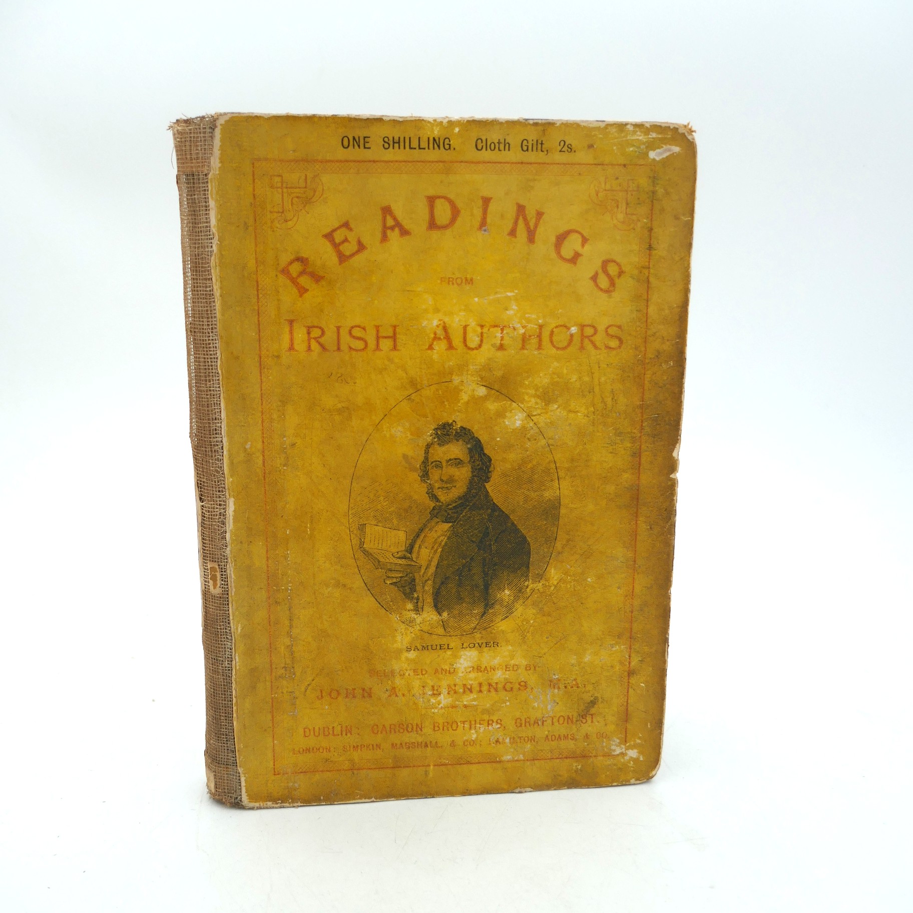 Readings from Irish Authors. Humorous and Pathetic. Selected and Arranged by John A. Jennings. Dublin: Carson Bros, 1883. First Edition. Pp 256, [adverts]. Yellow paper boards, portrait to upper cover. Spine worn (paper covering lacking), covers faded; contents pages in good condition.