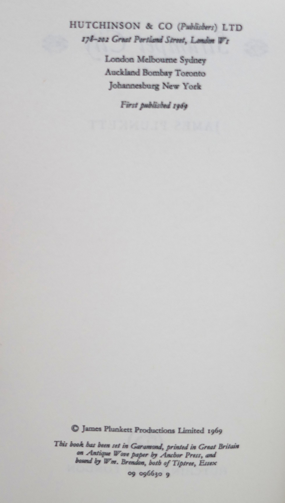Strumpet City. London: Hutchinson, 1969. First Edition. Pp, 578. Black cloth boards in pictorial dust jacket. Light wear to jacket at head of spine, otherwise a nice bright copy.