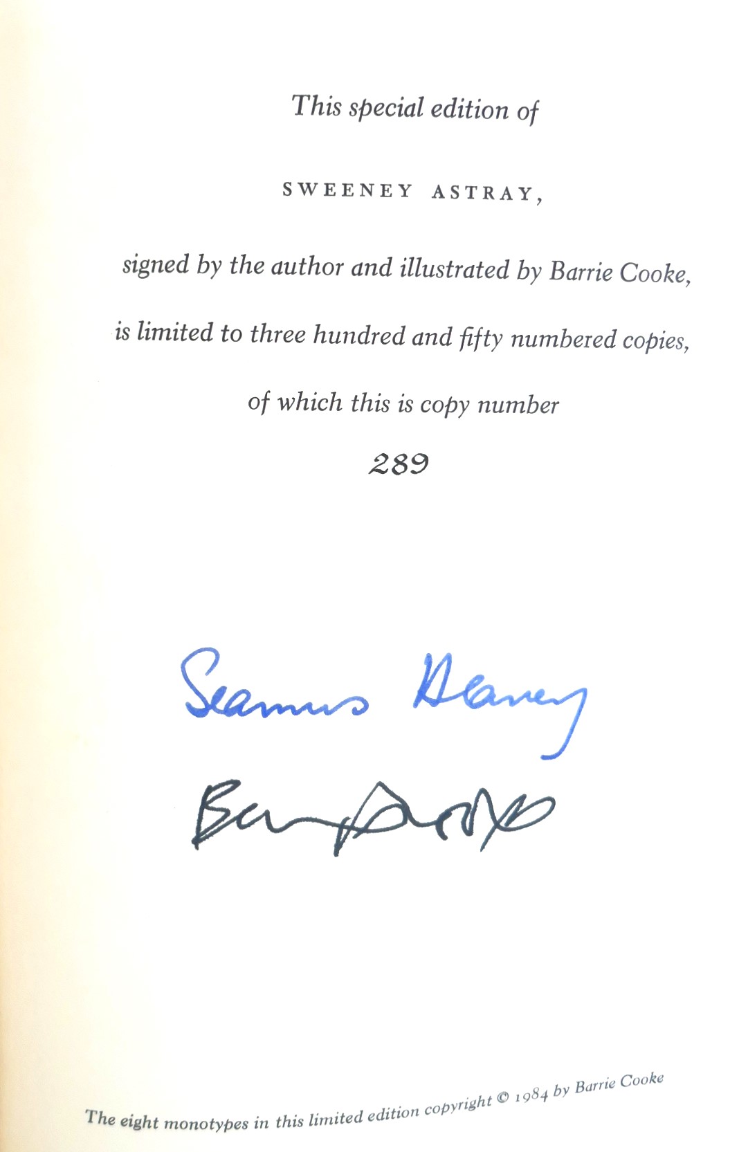 Sweeney Astray. A Version from the Irish. Illustrated by Barrie Cook. New York: Giroux. 1984. New York: Giroux. 1984. Green cloth, gilt lettering to spine. A fine bright copy. Housed in its original cardboard box as issued by the publisher.