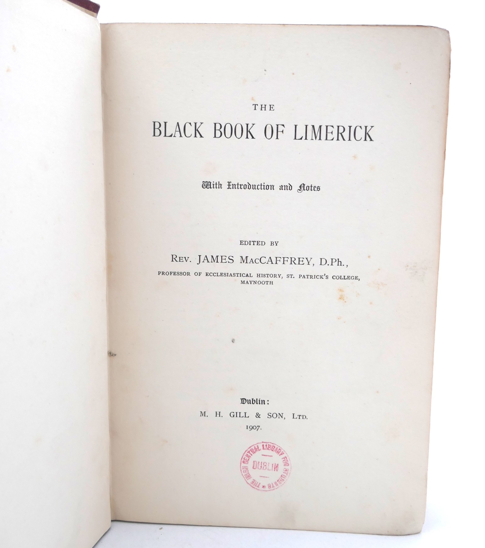 The Black Book of Limerick. With Introduction and Notes. Dublin: Gill, 1907. First Edition. Pp cxx, 187. Ex library copy, with stamps. Publisher’s maroon cloth boards, title in gilt to spine. A good copy.