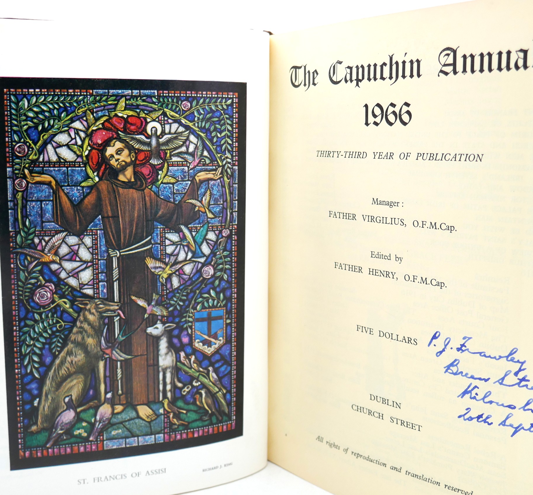 The Capuchin Annual 1966. Thirty-Third Year of Publication. Dublin: Church Street, 1966. Pp 564 (including over 50 pages of adverts). Publisher’s brown pictorial wrappers lettered in red. Neat ownership inscription to title page, otherwise a fine bright copy.