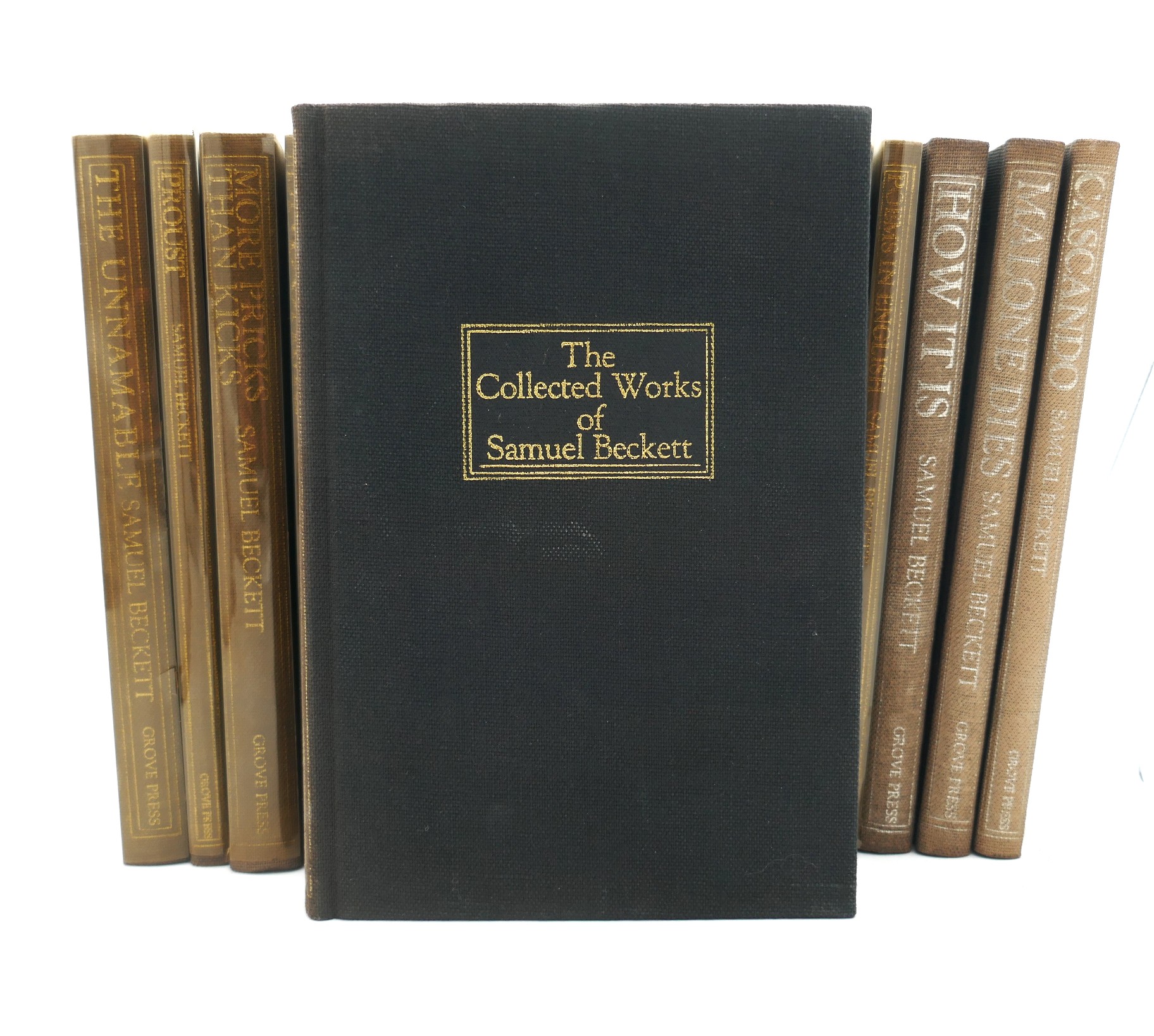 The Collected Works of Samuel Beckett. New York: Grove Press, 1970. First Edition, Limited Issue. Sixteen Volumes. Publisher’s black cloth, spine and front cover stamped and lettered in gold. Light fading to spines, (more pronounced to three of the volumes), otherwise a nice bright set.