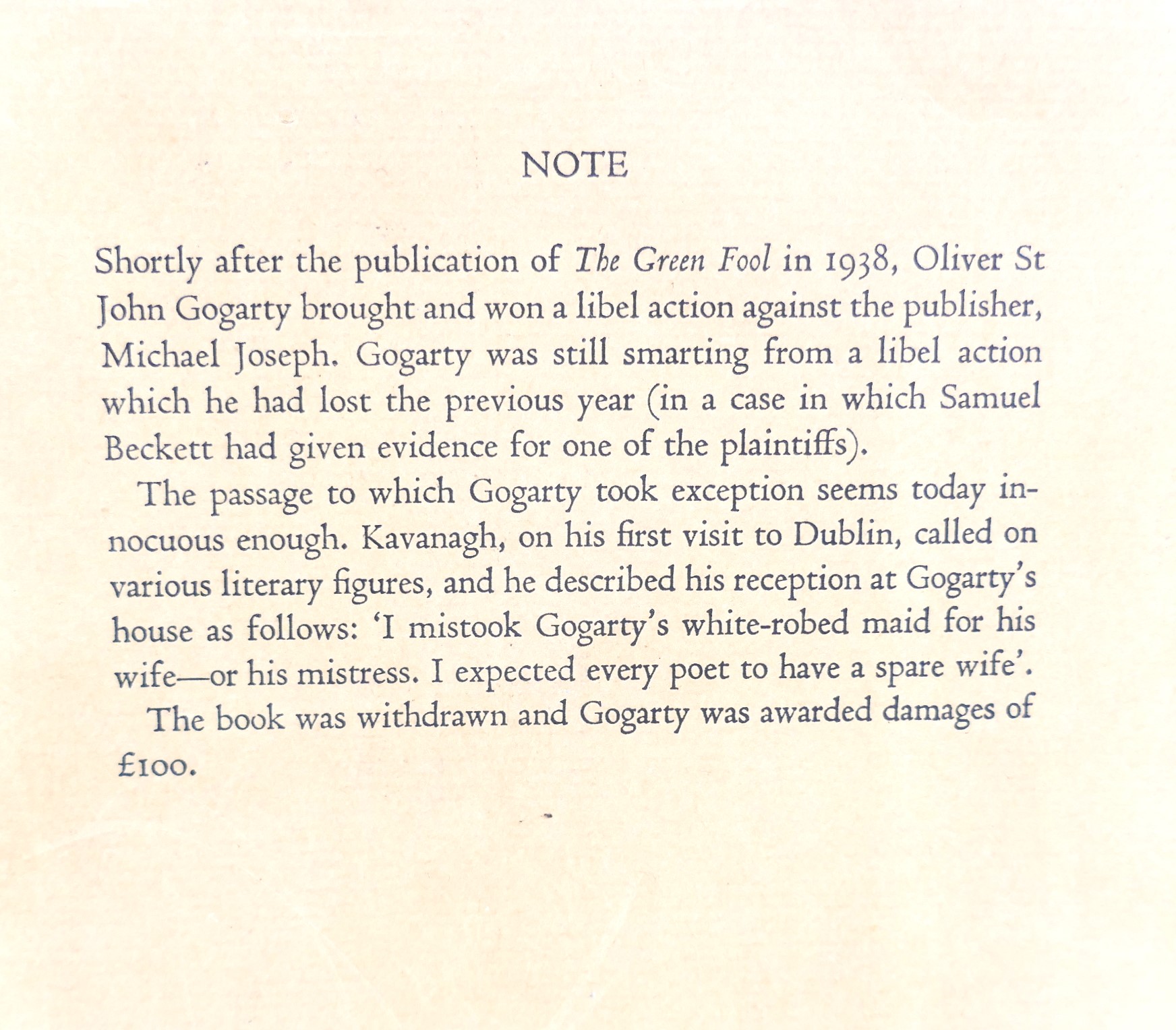 First published by Michael Joseph in 1938, the first issue was taken out of publication due to a libel action against the publisher by St. John Gogarty & reissued with the offending paragraph removed.
