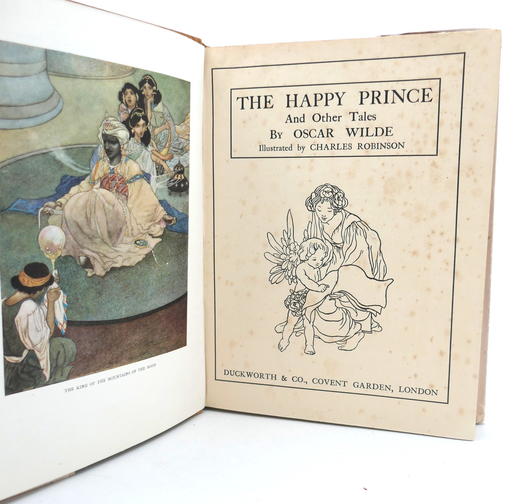 The Happy Prince and Other Stories. Illustrated in colour by Charles Robinson. London: Duckworth, 1920. Second (Robinson) edition. Small folio. Buff cloth covers, title and illustration to upper cover and spine, illustrated endpapers and original pictorial dust jacket, chipped at edges. A very good copy.