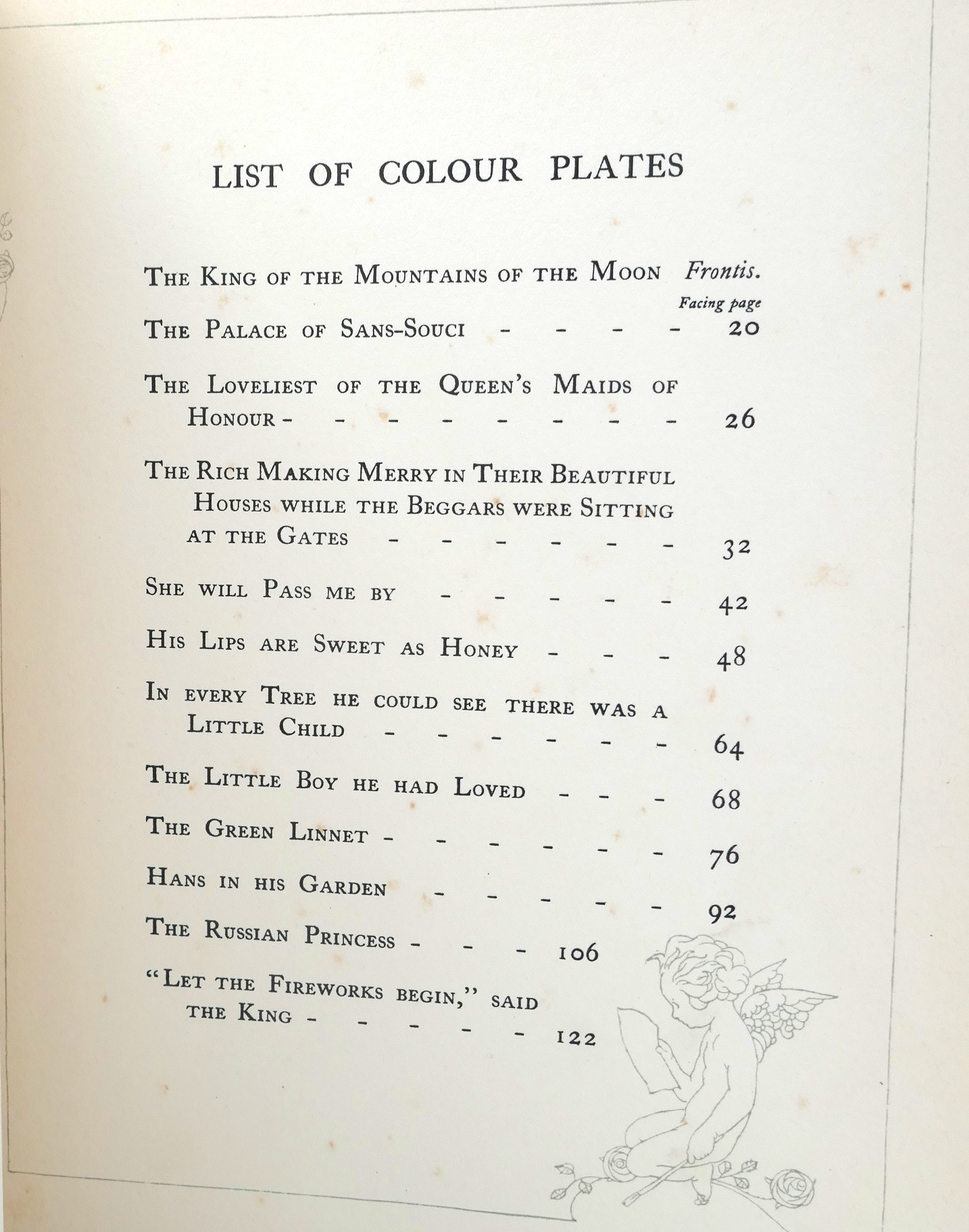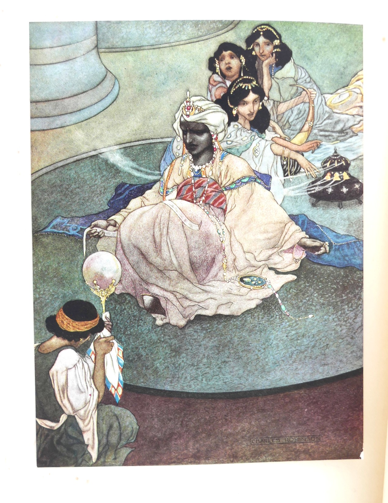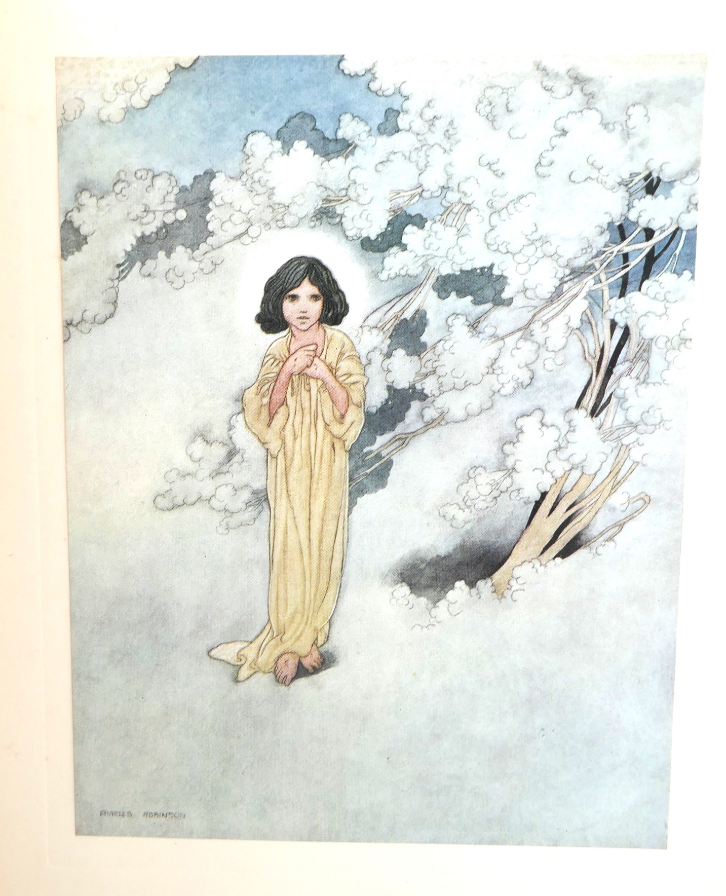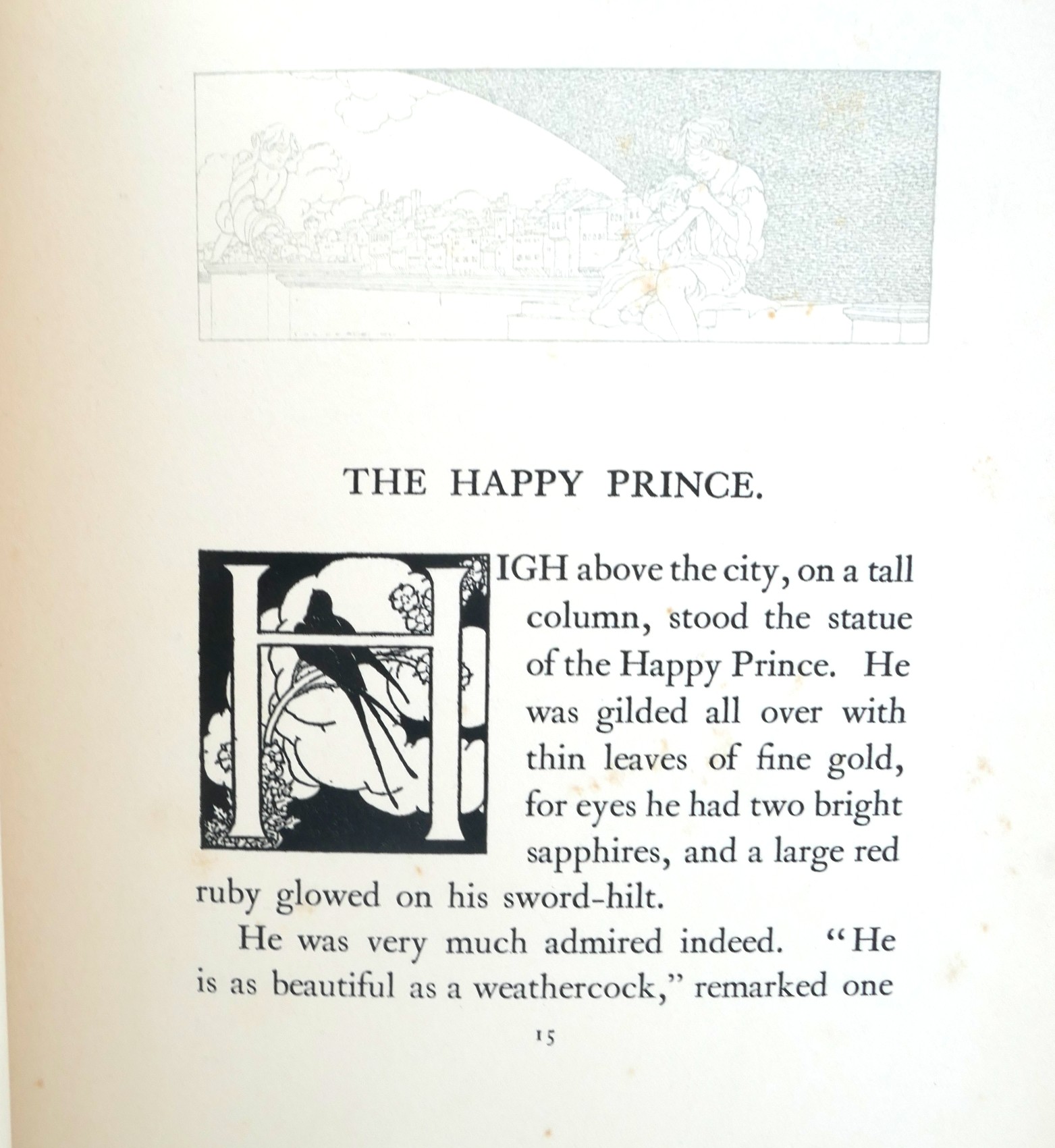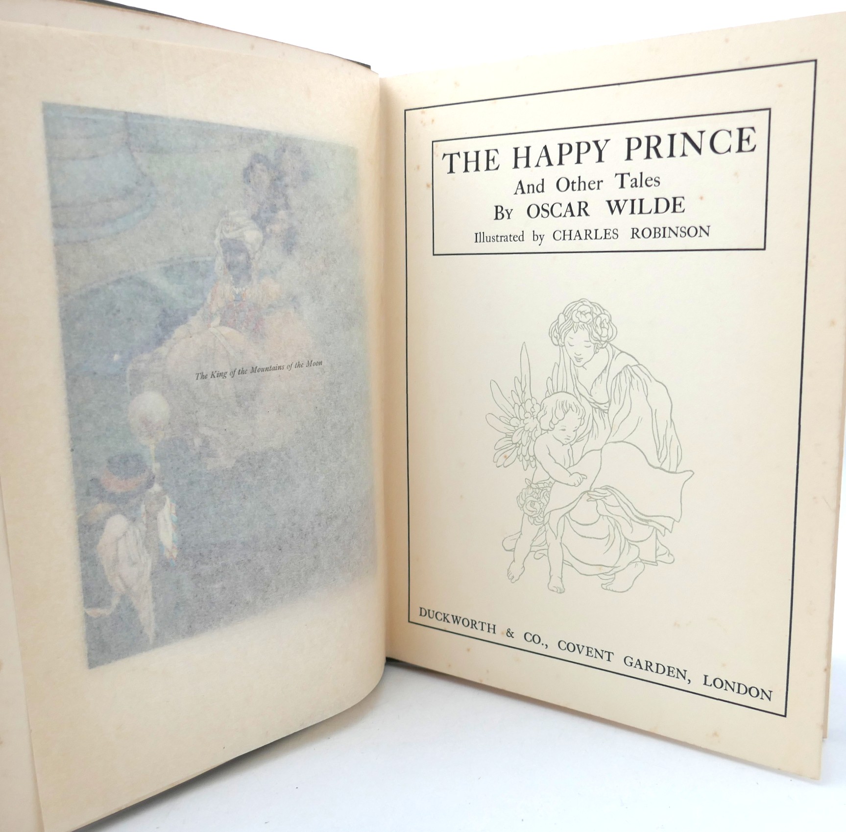 The Happy Prince and Other Stories. Illustrated by Charles Robinson. London: Duckworth & Co. 1913. New Edition, reset (first thus). Green cloth boards, lettering & illustrated in blind, pictorial endpapers. Off-setting and spotting to contents pages. A nice bright copy.