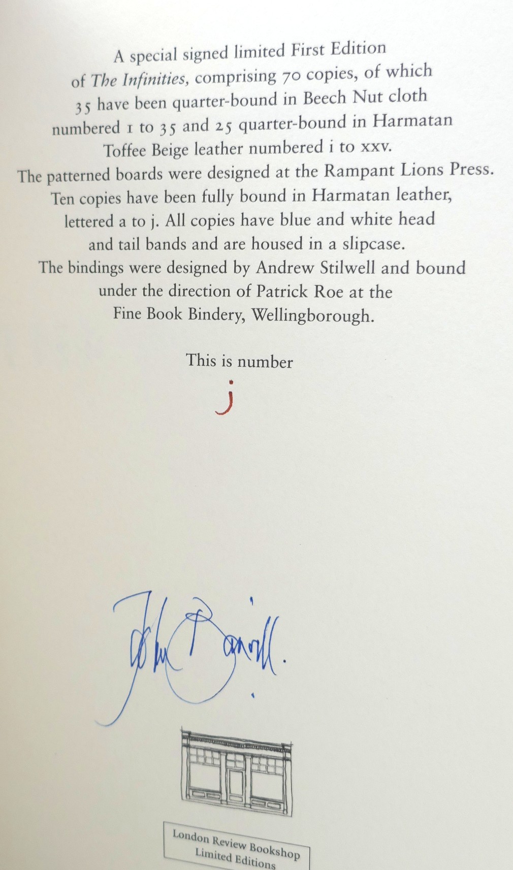 The Infinities. London Review Bookshop Limited Editions, 2009. First Edition, Limited Issue. Bound in full harmatan leather in a matching cloth slipcase. A fine bright copy.