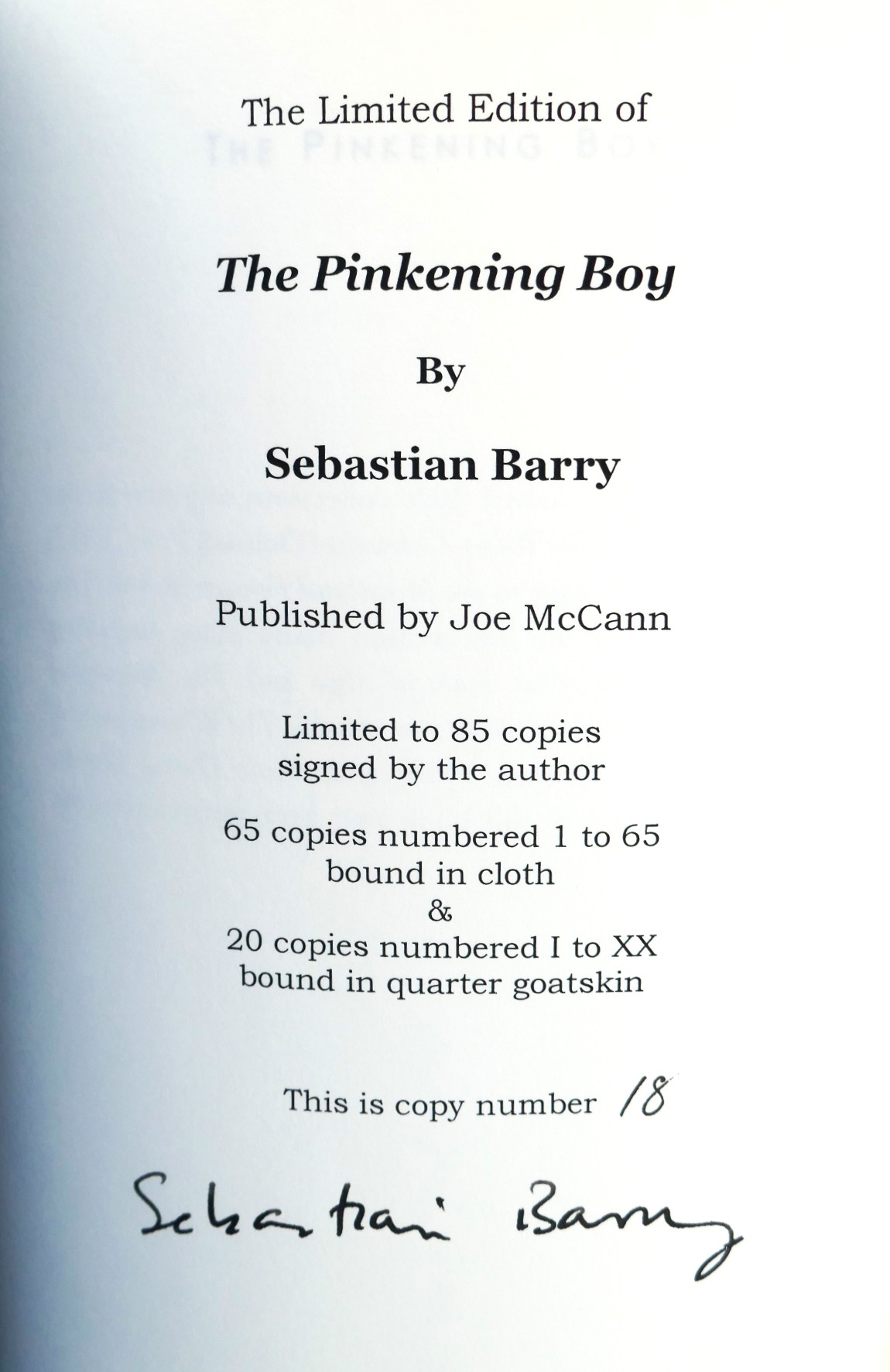 The Pinkening Boy. Oxford: Joe McCann, 2004. First Edition, Limited Issue. Pp, 25. Brown cloth, title label to upper board. Fine copy.