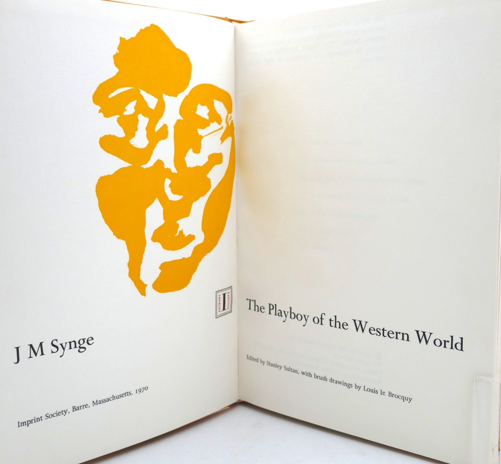 The Playboy of the Western World. Edited by Stanley Sultan, with Six Brush Drawings by Louis Le Brocquy. Massachusetts: Imprint Society, 1970. First Edition. Pp, 132. Full canary yellow buckram by John F. Newman (Dublin), with gilt portrait of Synge on front cover. Housed in matching slipcase, with publisher’s wrap-around band present. A near fine copy, contents pages bright & clean.