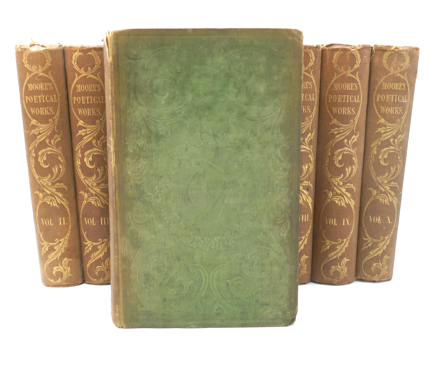 The Poetical Works of Thomas Moore. Collected by Himself. In Ten Volumes. London: Longman, Orme, Brown, Green & Longmans, 1840-1841. Publisher’s green cloth boards, with shamrocks & harp blind embossed covers, gilt decoration & lettered spine. Covers browned & lightly faded, tape repair to hinge of half-title of vol 1. Contents pages throughout in nice bright condition.