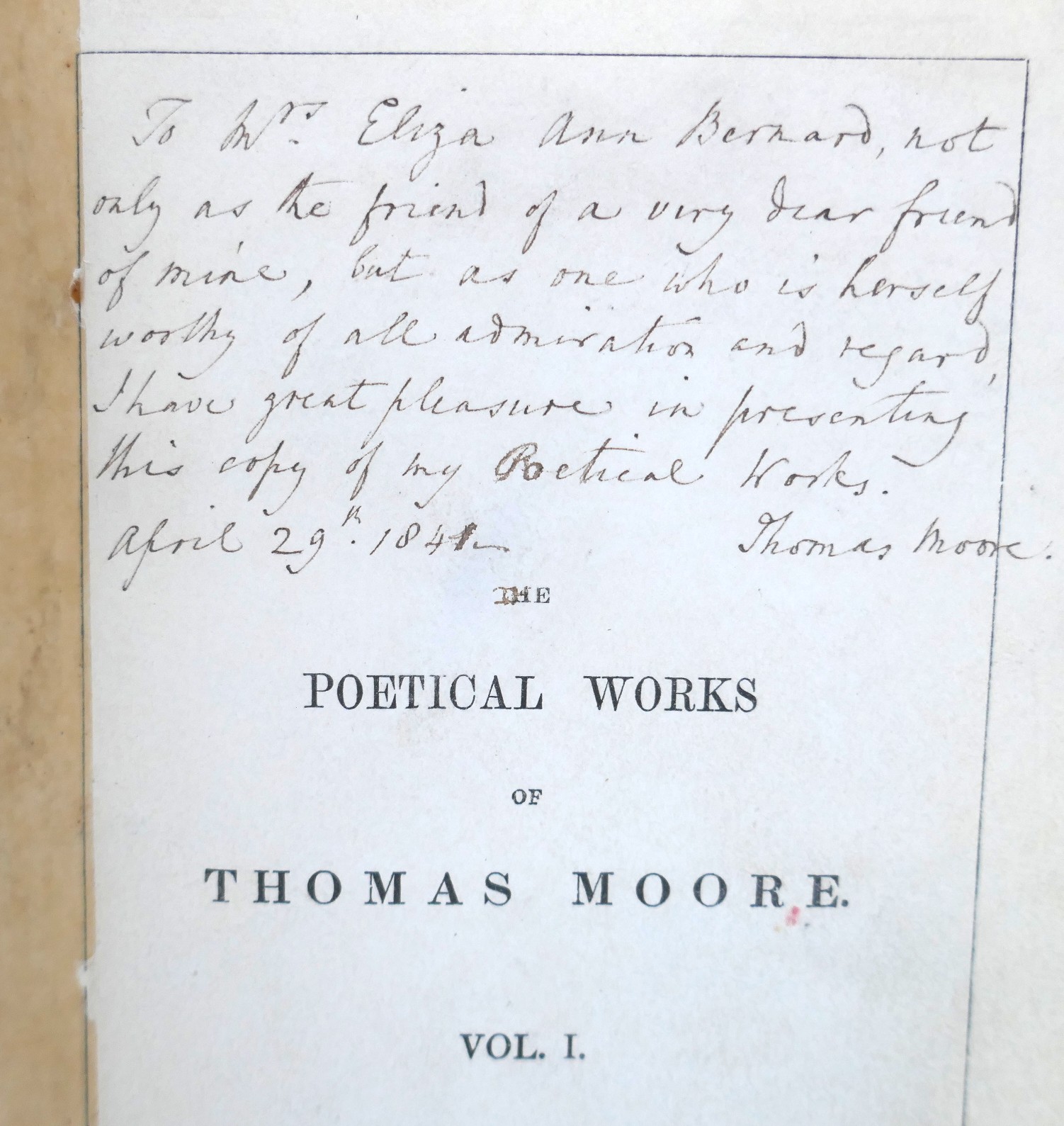 “From the Author,” with further inscription on half-title: “To Mrs. Eliza Ann Bernard, not only as the Friend of a very dear friend of mine, but as one who is herself worthy of all admiration and regard, I have great pleasure in presenting this copy of my Poetical Works, April 29th, 1841, Thomas Moore.”