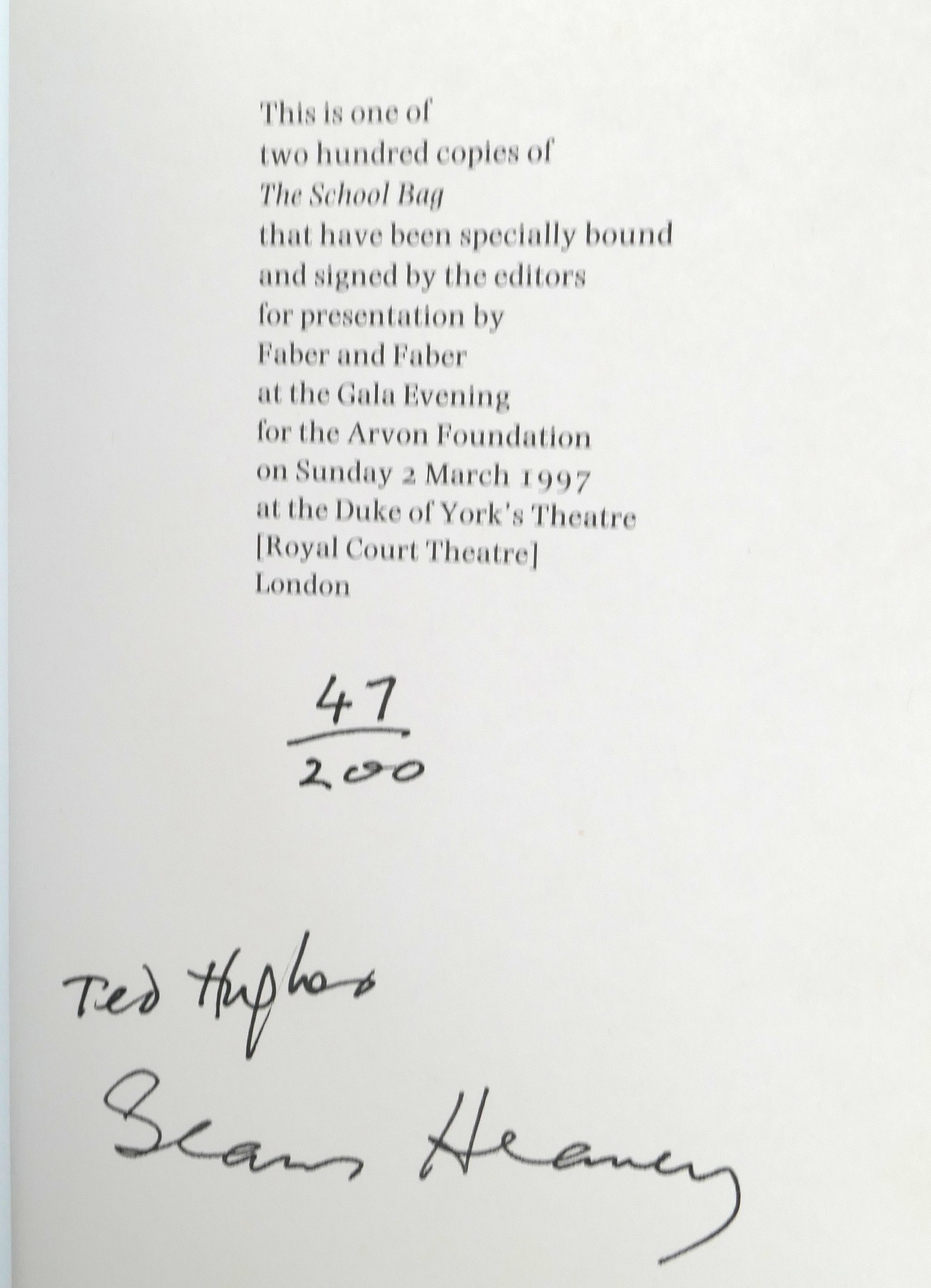 This edition was specially published for presentation by Faber and Faber at the Gala evening for the Arvon Foundation on Sunday 2nd March 1997 at the Duke of York’s Theatre (Royal Court Theatre) London.