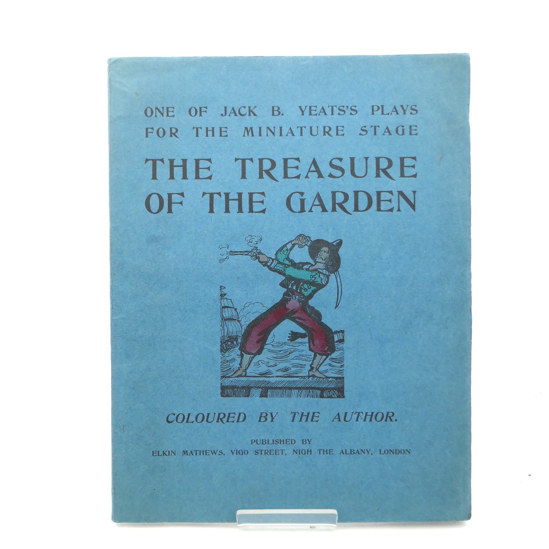 The Treasure of the Garden. A Play by Jack B. Yeats. Scenes and Characters Together with Book of the Word and Full Directions of Playing on a Miniature Stage. Elkin Mathews [1902]. First Edition. Publisher’s blue titled wrappers, front cover lettered in black together with vignette hand-coloured by the artist, rear cover with publisher’s motif in black. A near fine copy, colouring remains bright & vivid.