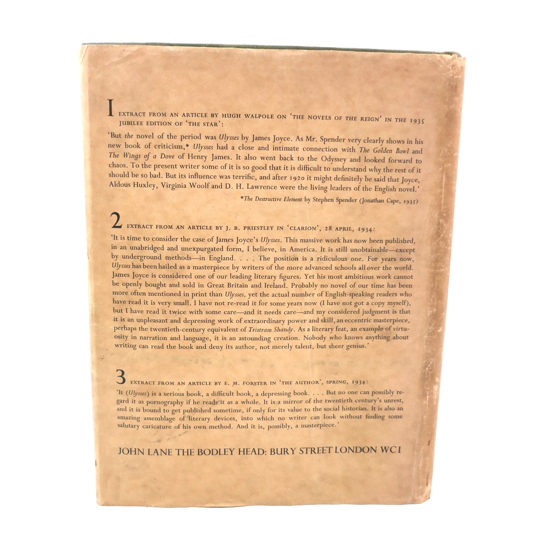 A classic of modern British book design, with the binding designed by the English Artist and typographer Eric Gill. Gill’s bow was reproduced on subsequent Cape trade editions and has become a widely recognised symbol of Joyce’s great novel. The text of this edition is based on that of the Olympia Press edition, revised by Stuart Gilbert to Joyce’s instructions (Slocum A20). This edition includes two appendices bringing together the material from the 1934 Random House edition relating to the lifting of the ban on the book in the United States; the text of the injunction granted in favour of Joyce against the publisher Samuel Roth; the text of the ‘International Protest’ against Roth’s unauthorised serialization of Ulysses, with a full list of the signatories (including Virginia Woolf, T.S. Eliot and Ernest Hemingway); and a bibliography of Joyce’s works.