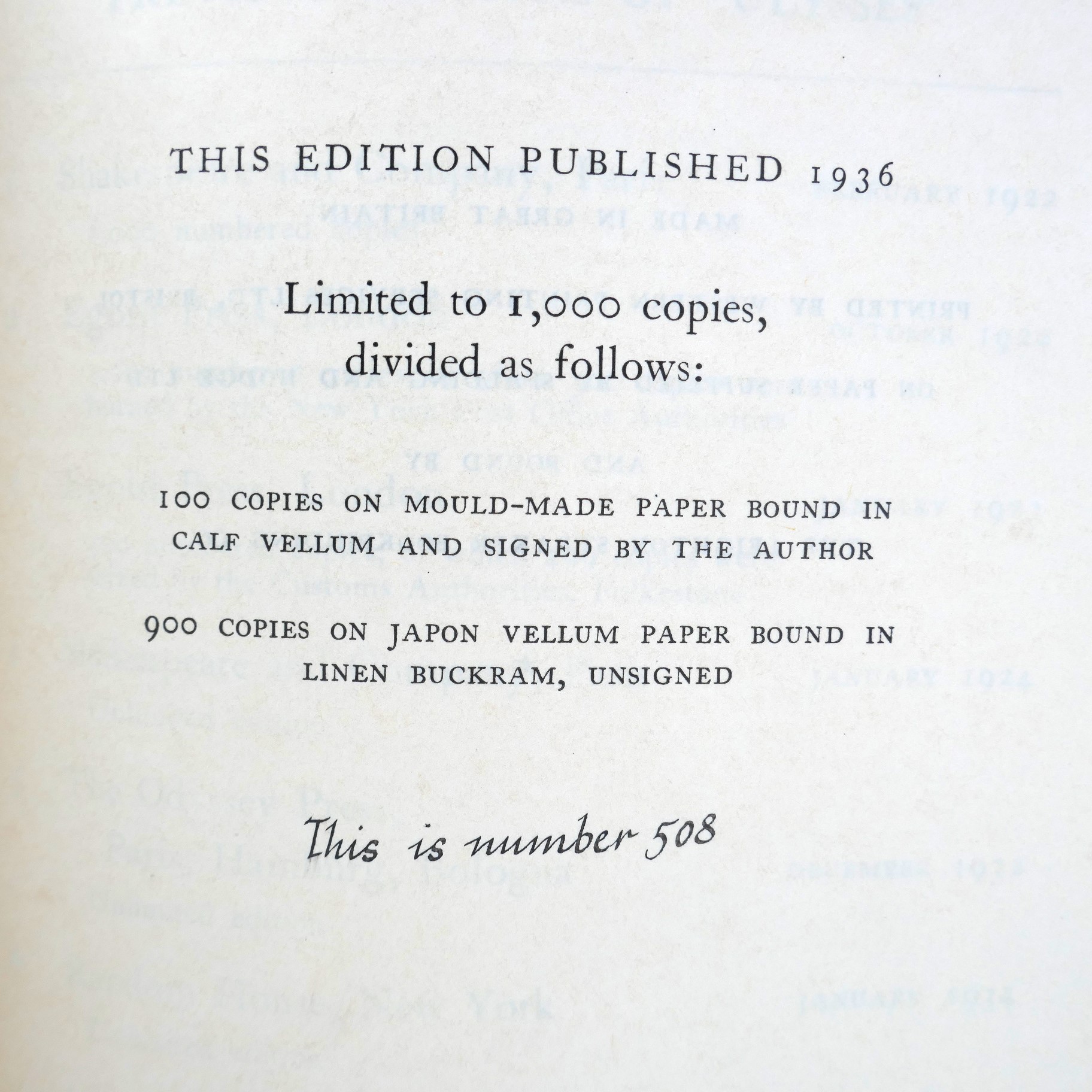 Limited Edition of 900 Copies on Japon vellum paper, this copy is number 508.