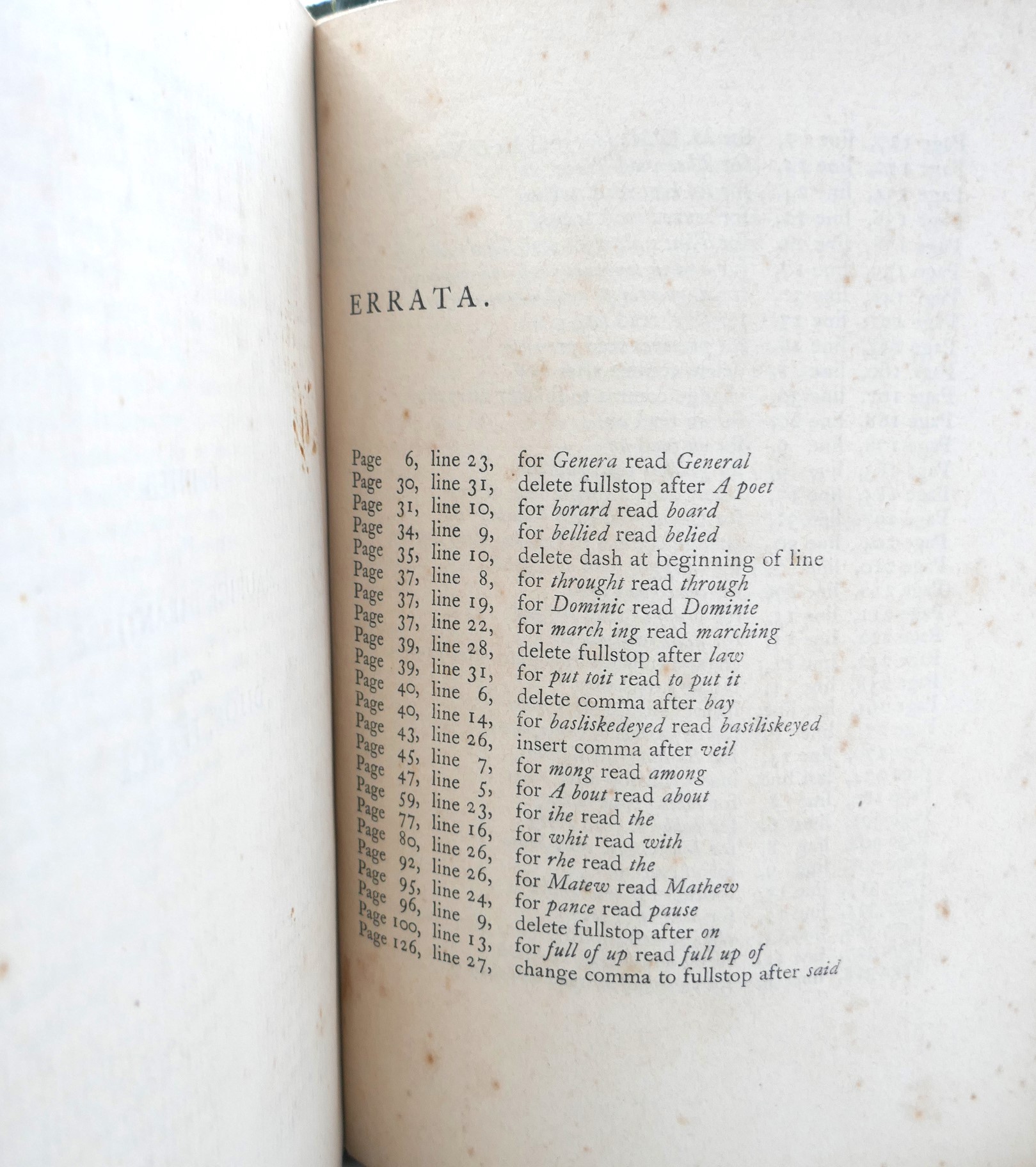 A longtime Joyce supporter, Harriet Weaver was determined to bring out her own edition of Ulysses. A socialist, she believed that her inheritance, “tainted by usury, was hers in trust,” and had signed a sizeable inheritance over to Joyce. She sent Joyce a £200 advance for an English edition, which was published for the Egoist Press by John Rodker of Paris, and printed by Beach’s printer Maurice Darentiere from the same plates as the first edition. Rodker laid in eight pages of Errata listing the over 200 typographical errors. Rodker’s edition includes the statement, “First Published by Shakespeare and Company, Paris: February 1922. Published By the Egoist Press, London: October 1922. . . . The Publishers apologize for the typographical errors, a list of which is appended.”
